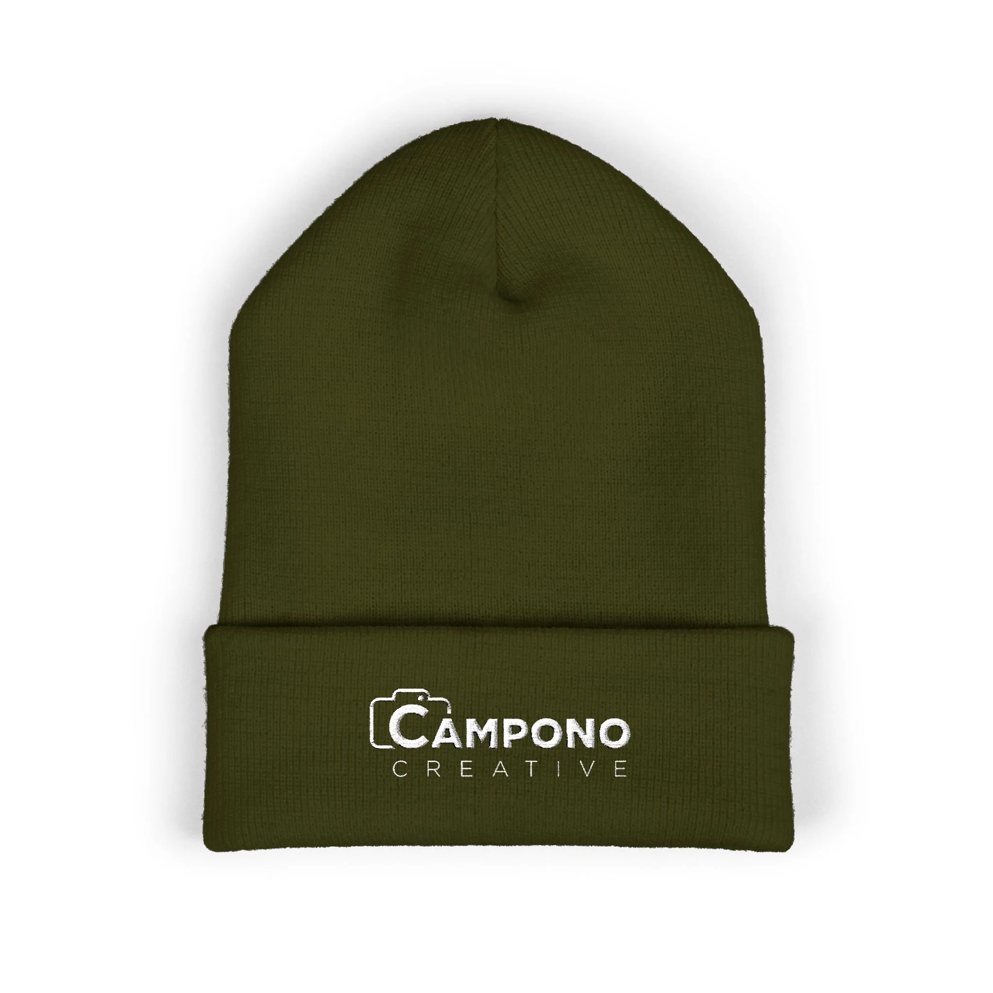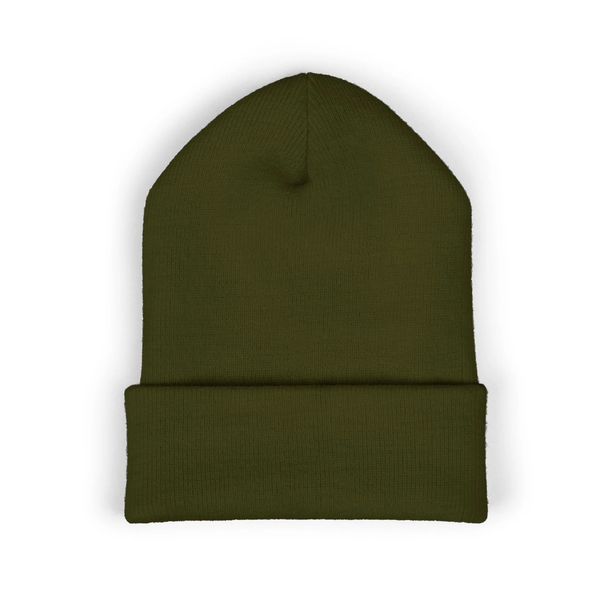 This embroidered cuffed beanie brings quiet utility and handcrafted detail to cold-weather wear. The deep olive knit folds into a substantial 12" cuff that frames the embroidered logo with clean contrast. It feels cozy without bulk — stretchy enough to fit a range of head sizes while keeping shape after repeated wear. Hypoallergenic turbo acrylic provides warmth and easy care, and the stitched emblem adds a subtle, artisanal touch that reads outdoorsy and refined. Wear it on early hikes, weekend markets, or slow coffee runs when you want a low-profile layer that still shows you care about craft and comfort.