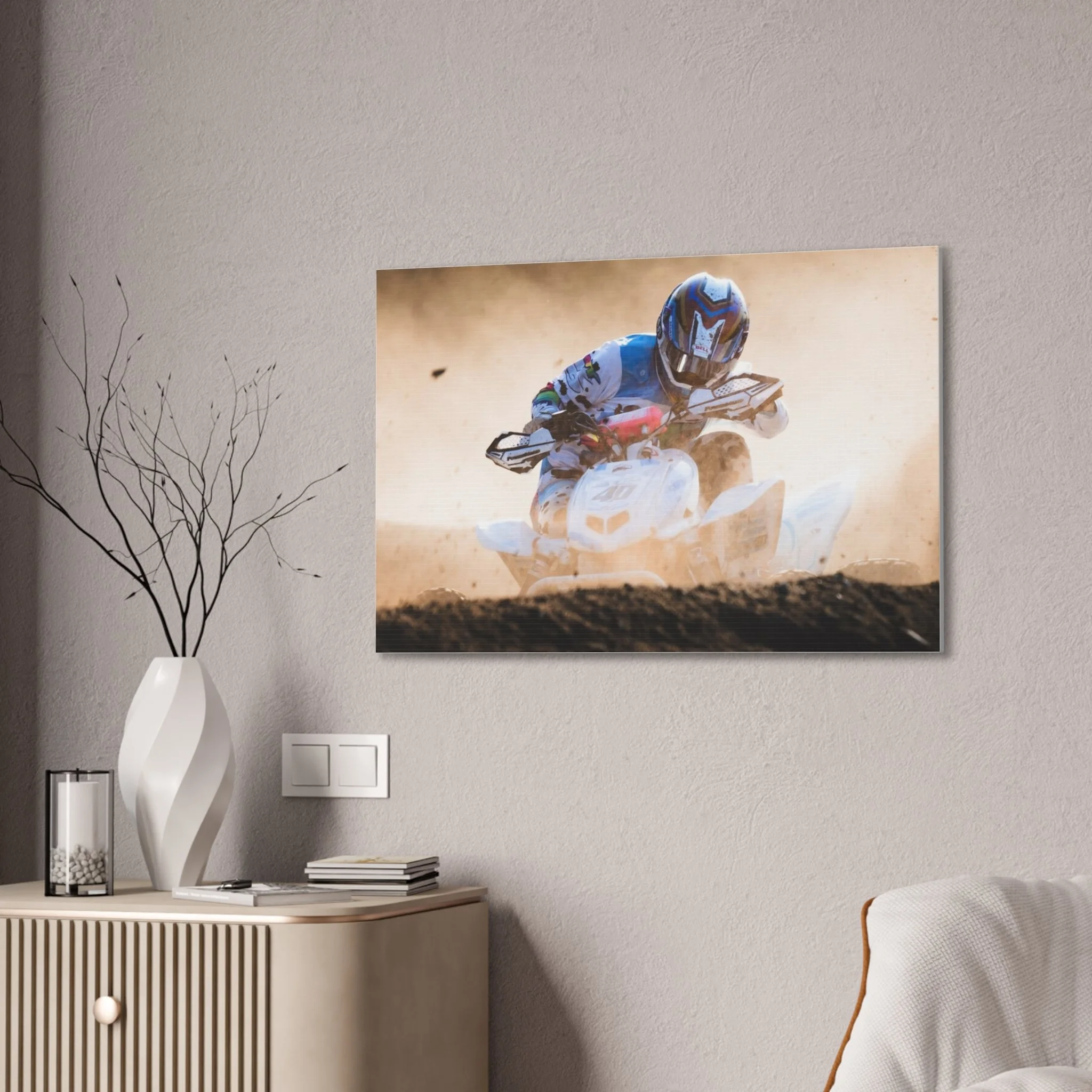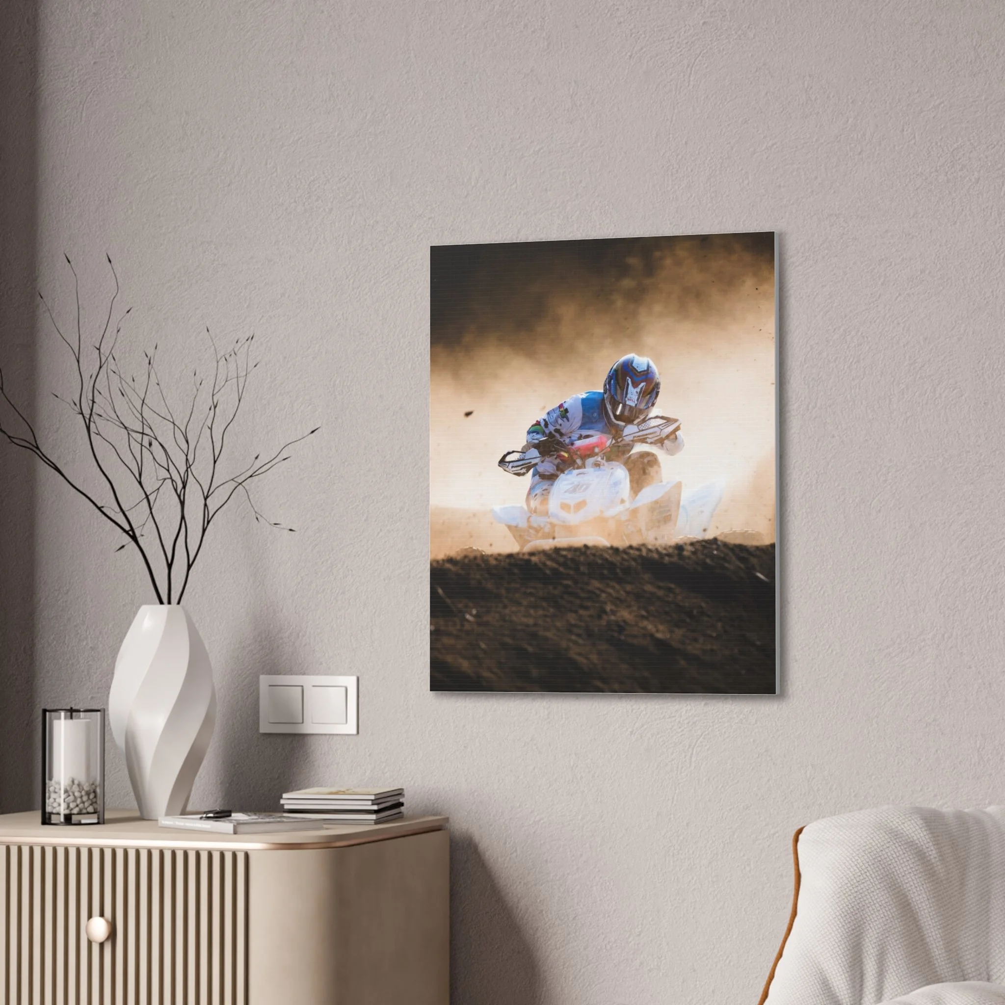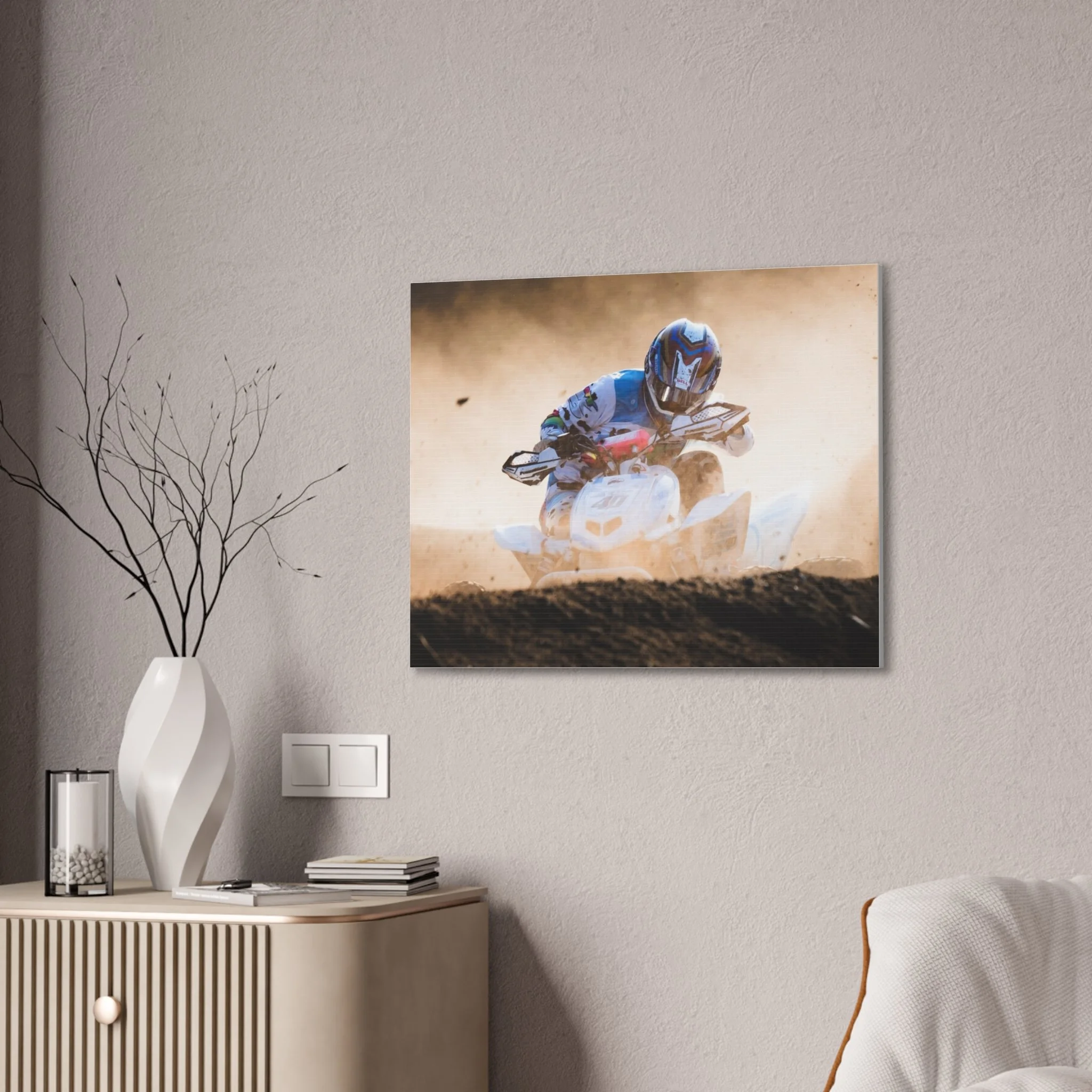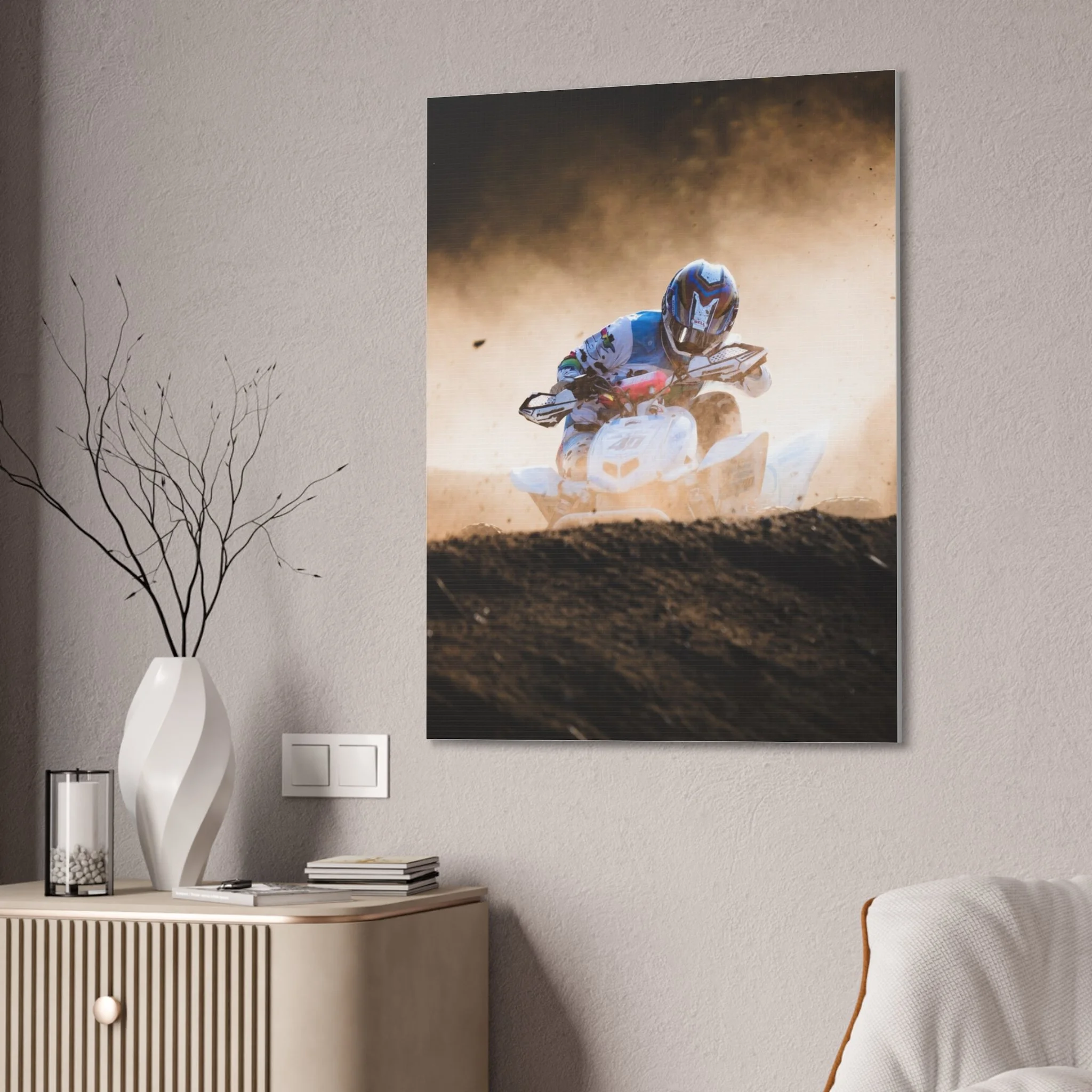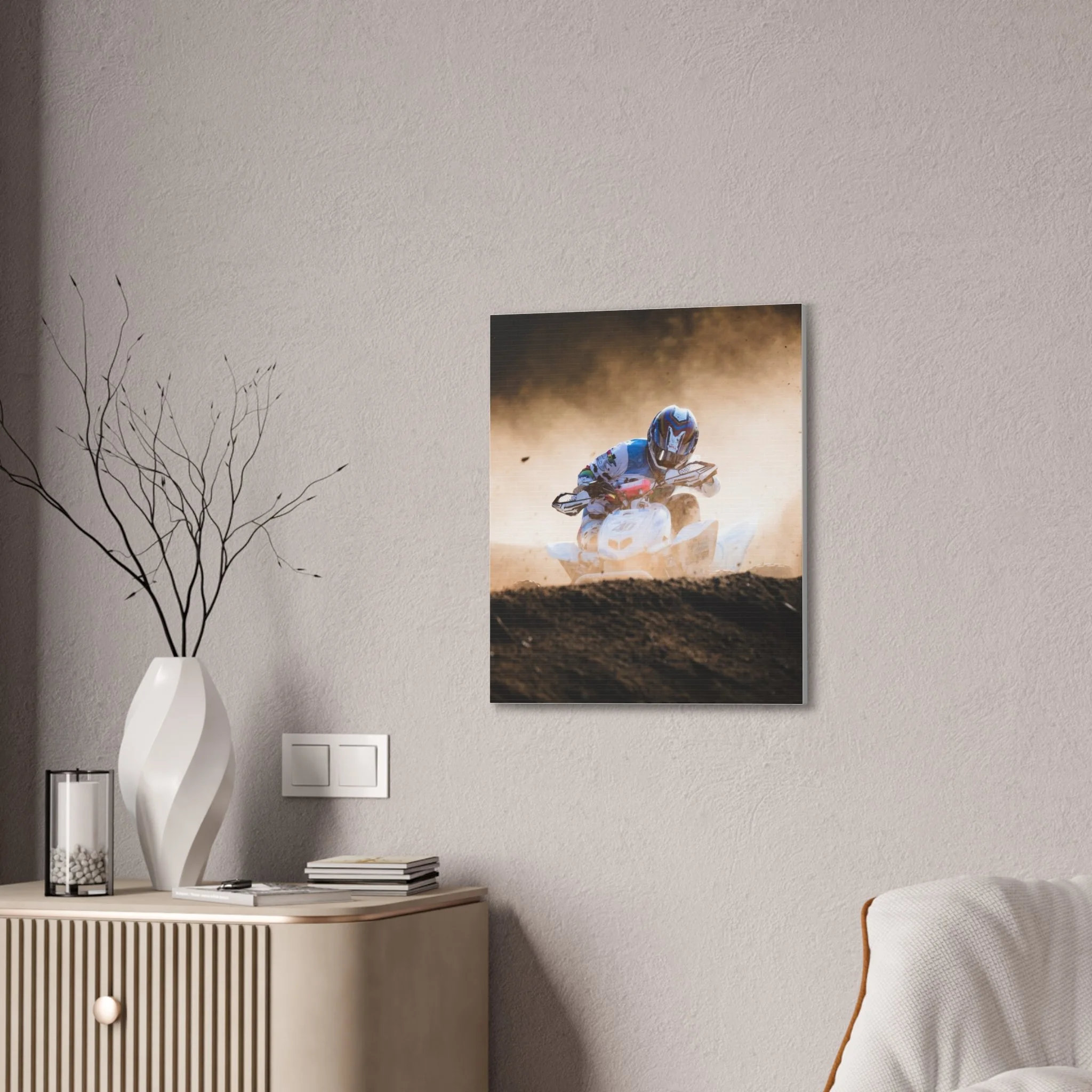 Bring the rush of open dirt and engine roar into any room with this personal photo stretched canvas print. The high-contrast image captures you mid-charge through a cloud of dust — grit, motion, and that split-second focus frozen on a durable polyester surface. Mounted on a sturdy pinewood frame with clean, white sides, the piece sits confidently on a wall, evoking garage scenes, track day memories, or a cabin corner where adventure gear lives. It reads like a snapshot of momentum: raw, immediate, and honest. Hang it above a workbench, in a rec room, or in a home office to remind you of throttle-down thrills and the quiet satisfaction after a long ride.
