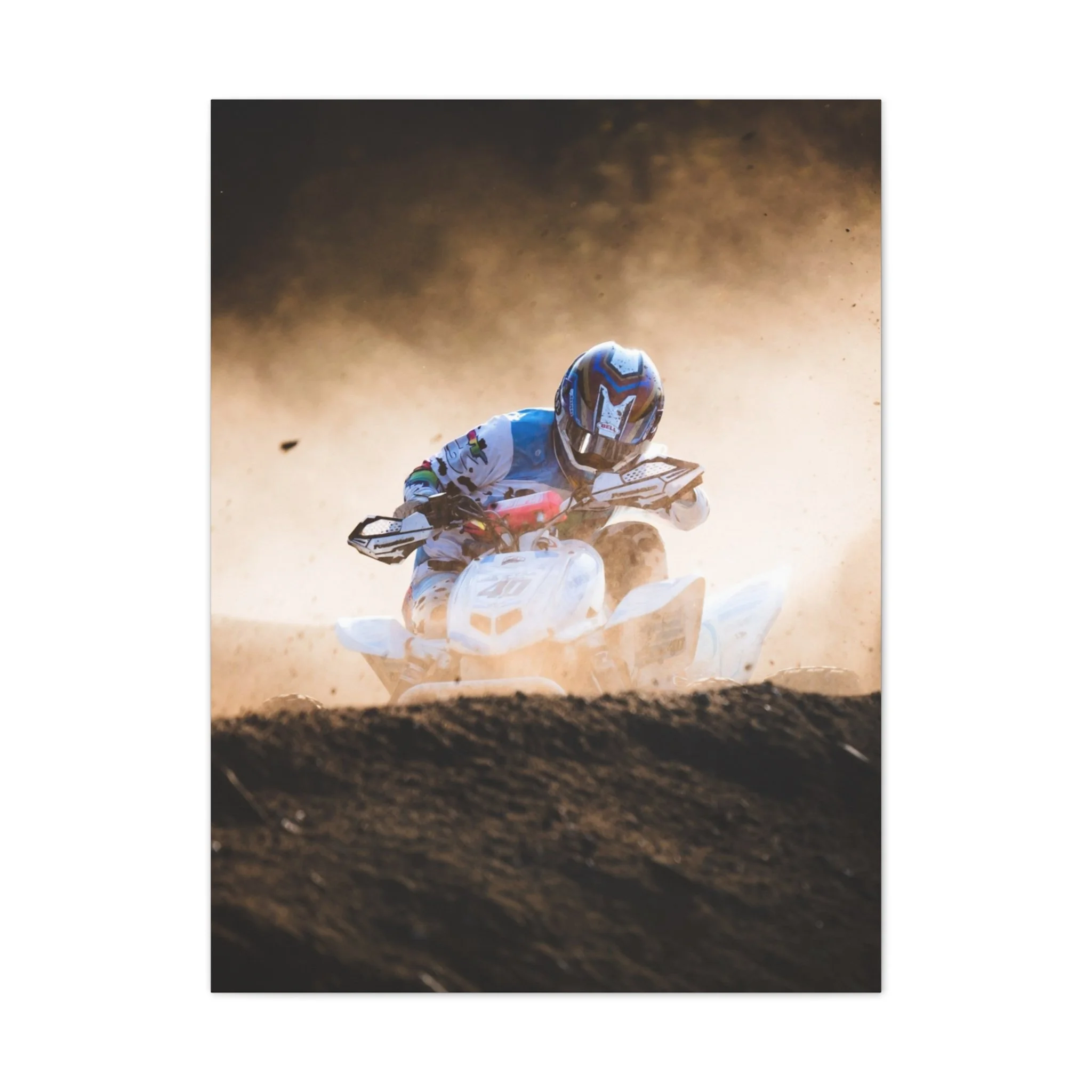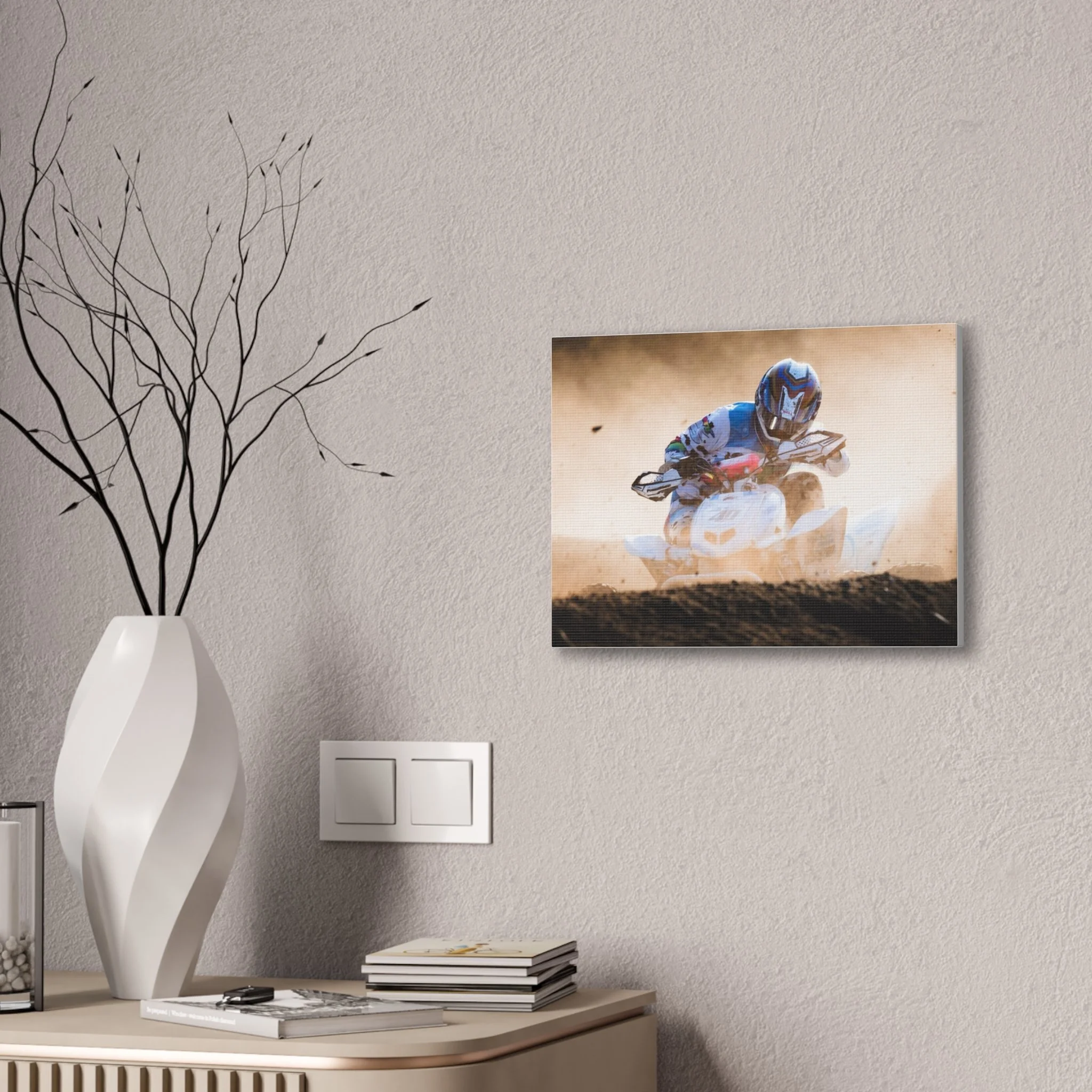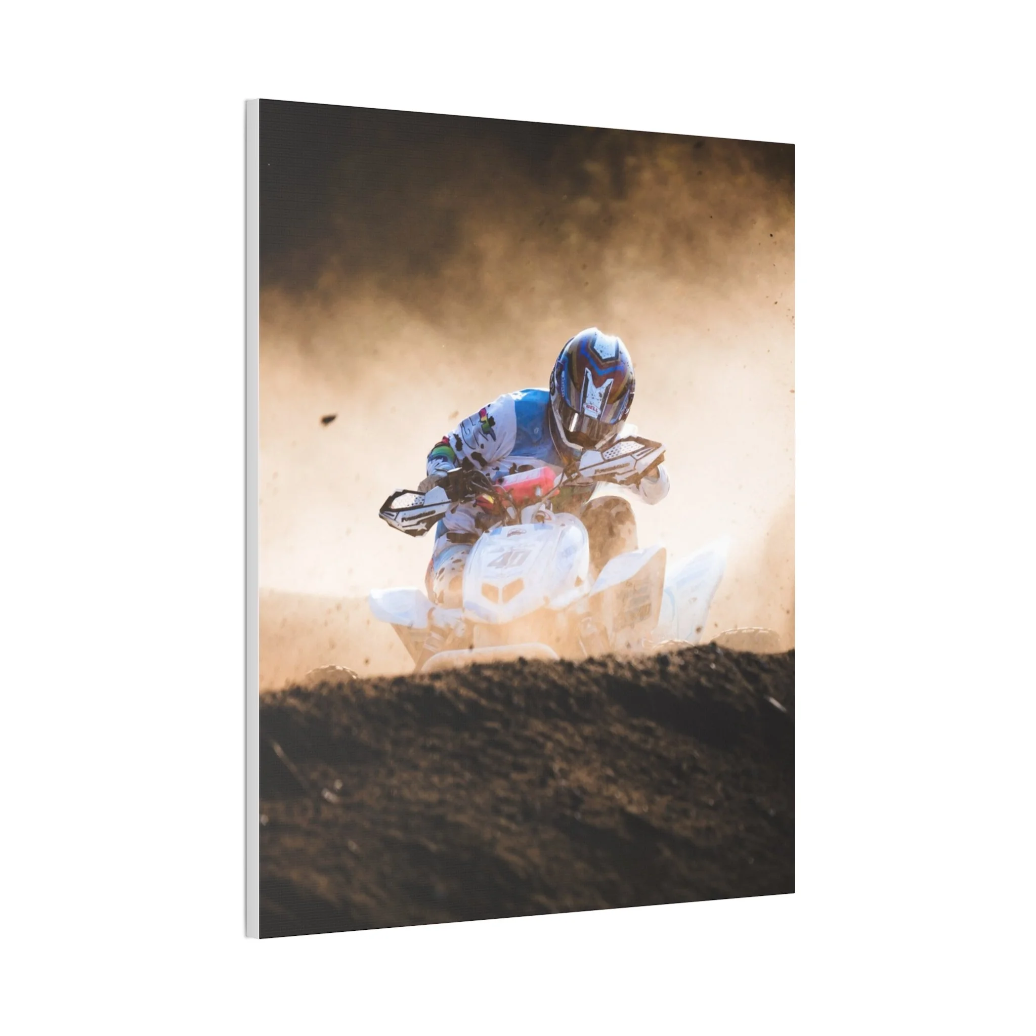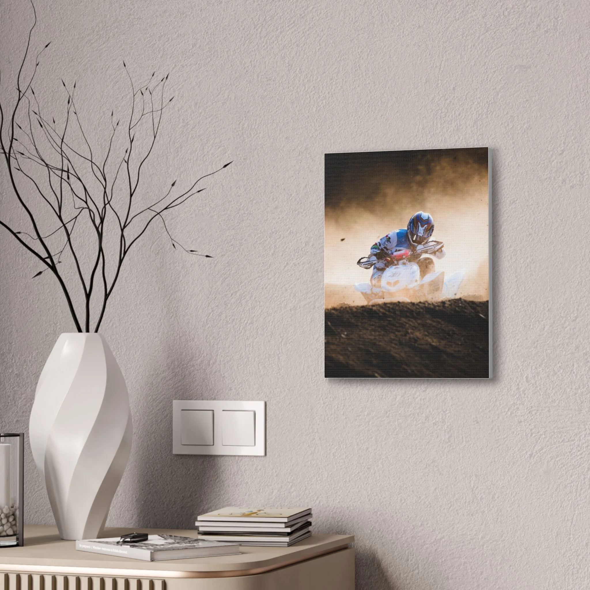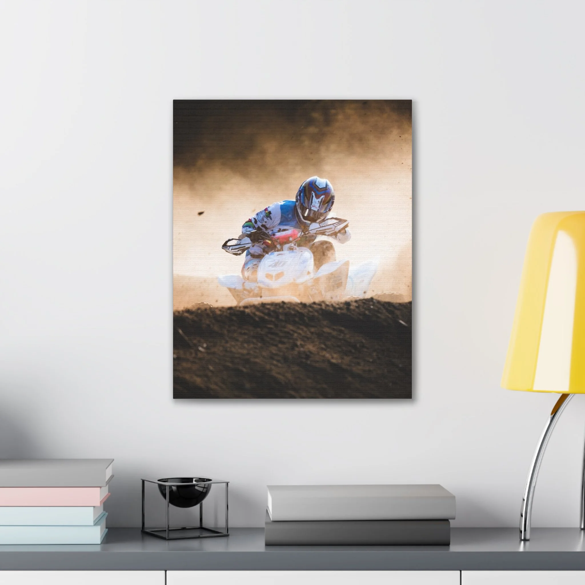Bring the rush of open dirt and engine roar into any room with this personal photo stretched canvas print. The high-contrast image captures you mid-charge through a cloud of dust — grit, motion, and that split-second focus frozen on a durable polyester surface. Mounted on a sturdy pinewood frame with clean, white sides, the piece sits confidently on a wall, evoking garage scenes, track day memories, or a cabin corner where adventure gear lives. It reads like a snapshot of momentum: raw, immediate, and honest. Hang it above a workbench, in a rec room, or in a home office to remind you of throttle-down thrills and the quiet satisfaction after a long ride.