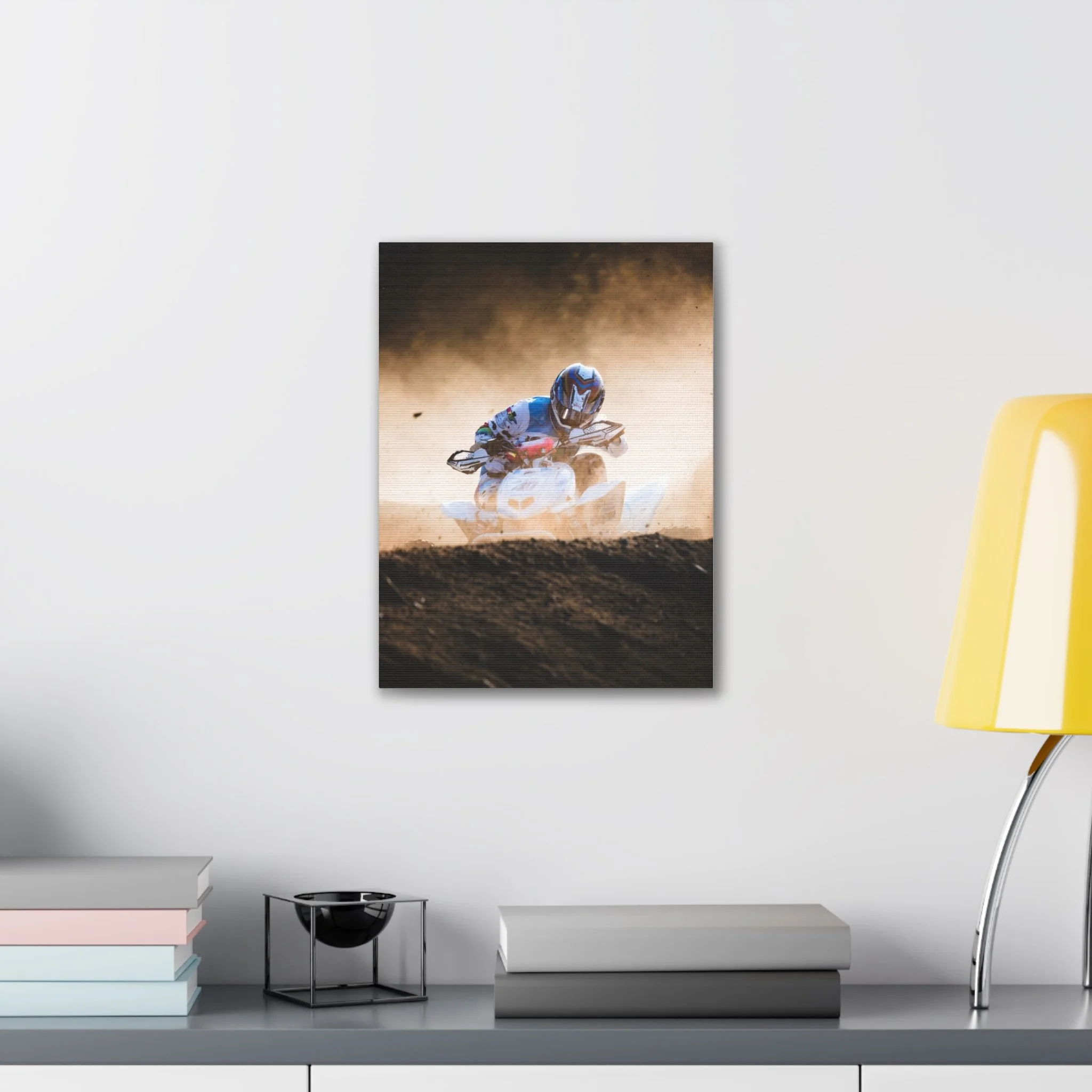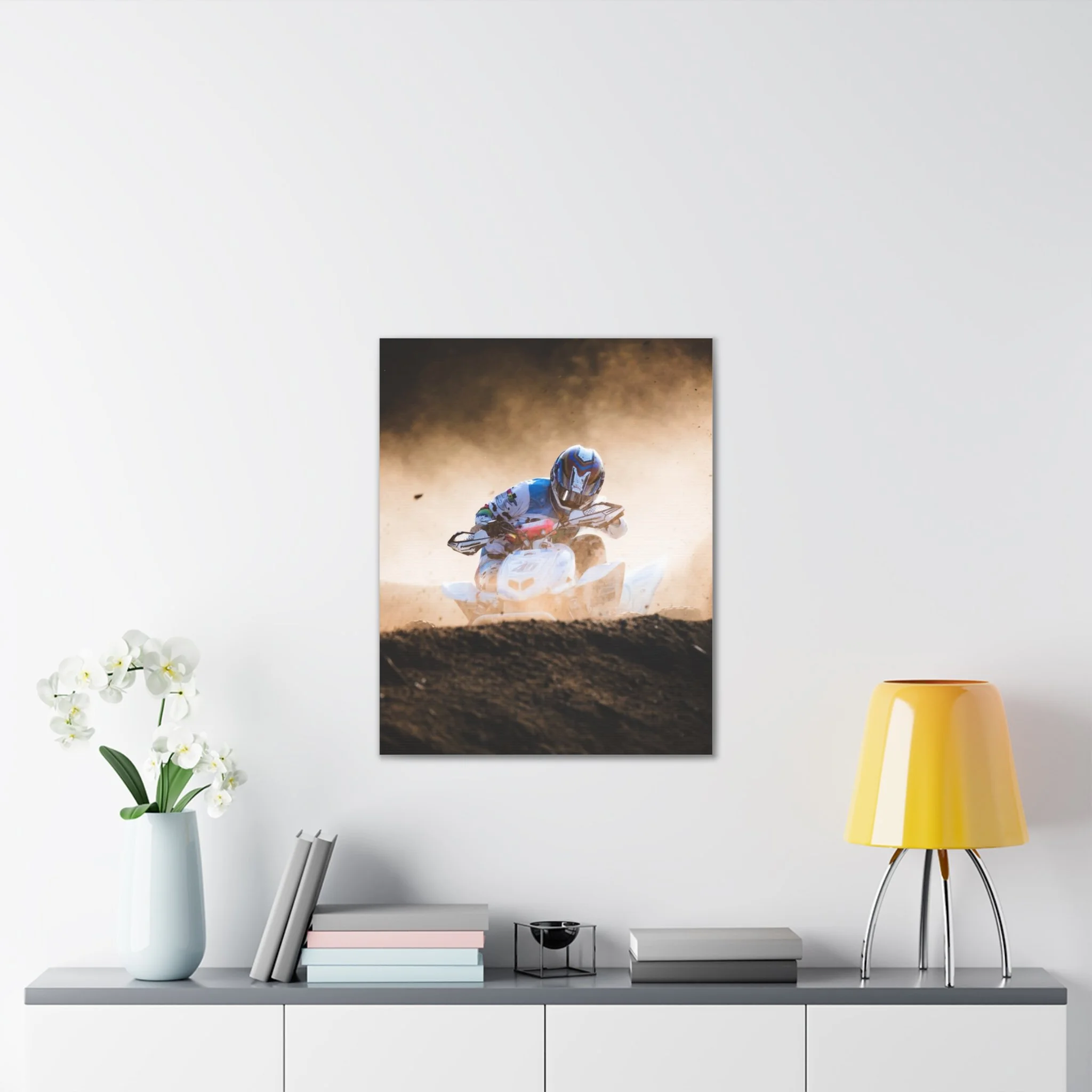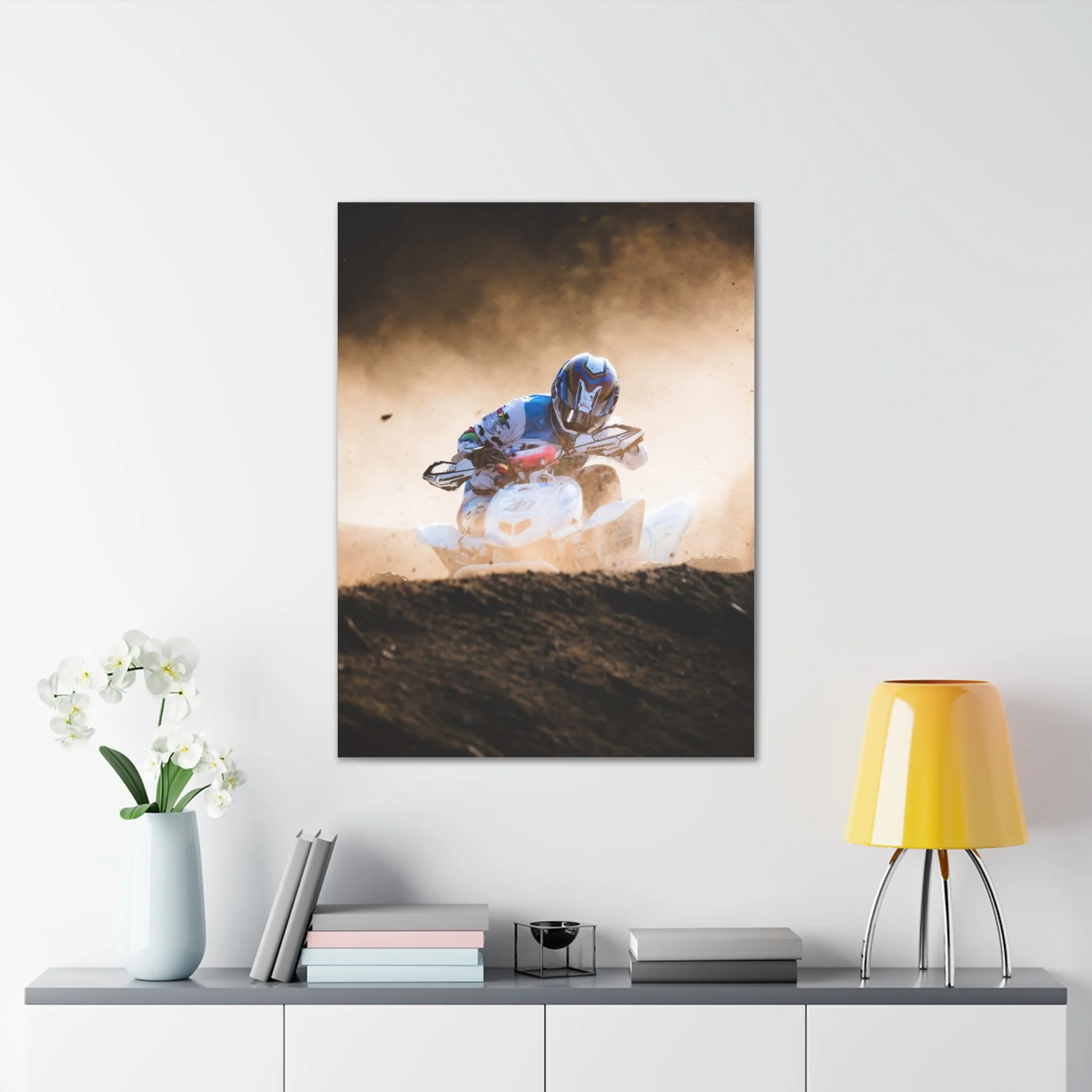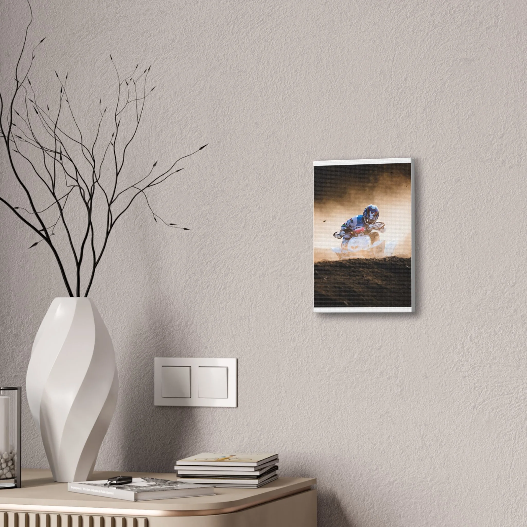 Bring the rush of open dirt and engine roar into any room with this personal photo stretched canvas print. The high-contrast image captures you mid-charge through a cloud of dust — grit, motion, and that split-second focus frozen on a durable polyester surface. Mounted on a sturdy pinewood frame with clean, white sides, the piece sits confidently on a wall, evoking garage scenes, track day memories, or a cabin corner where adventure gear lives. It reads like a snapshot of momentum: raw, immediate, and honest. Hang it above a workbench, in a rec room, or in a home office to remind you of throttle-down thrills and the quiet satisfaction after a long ride.