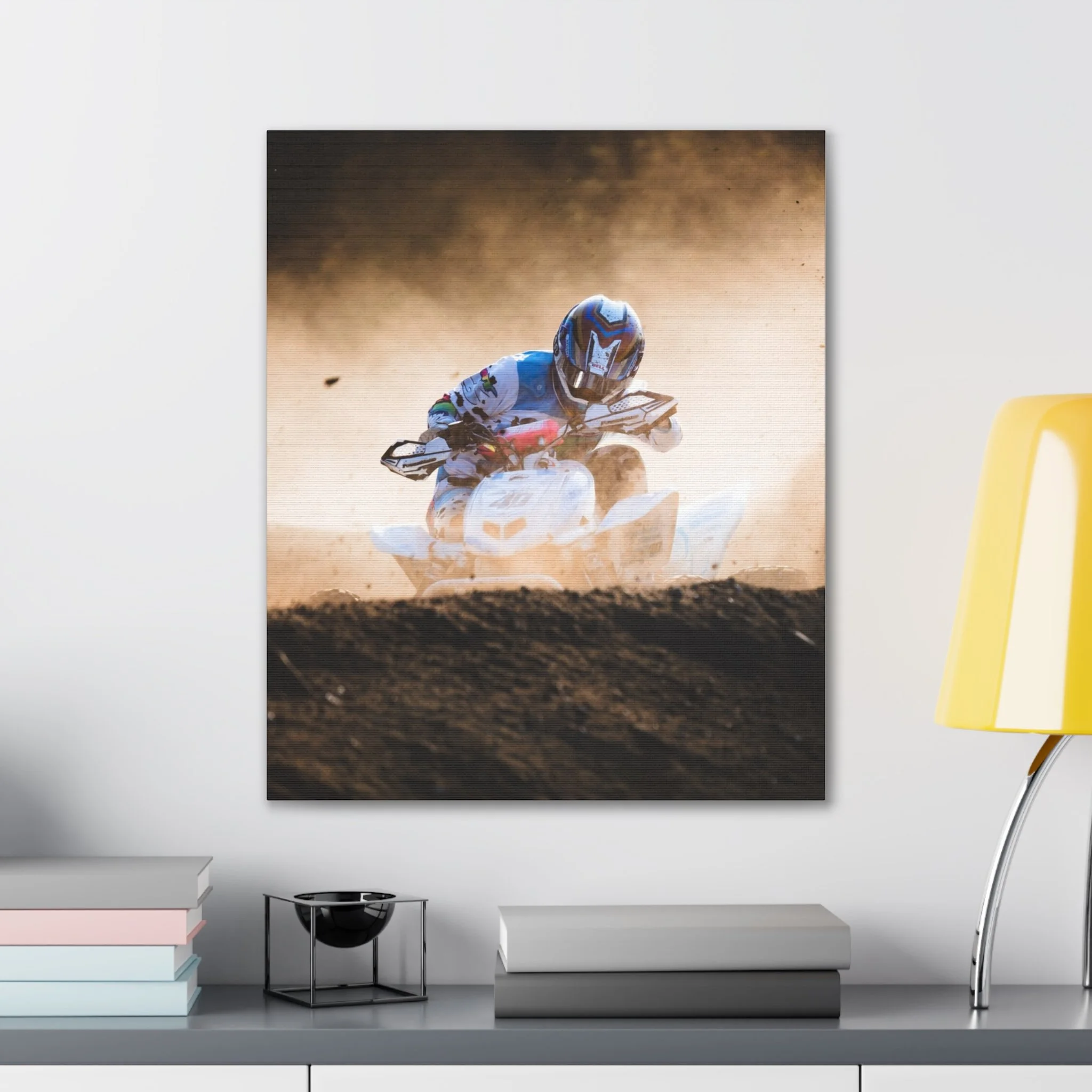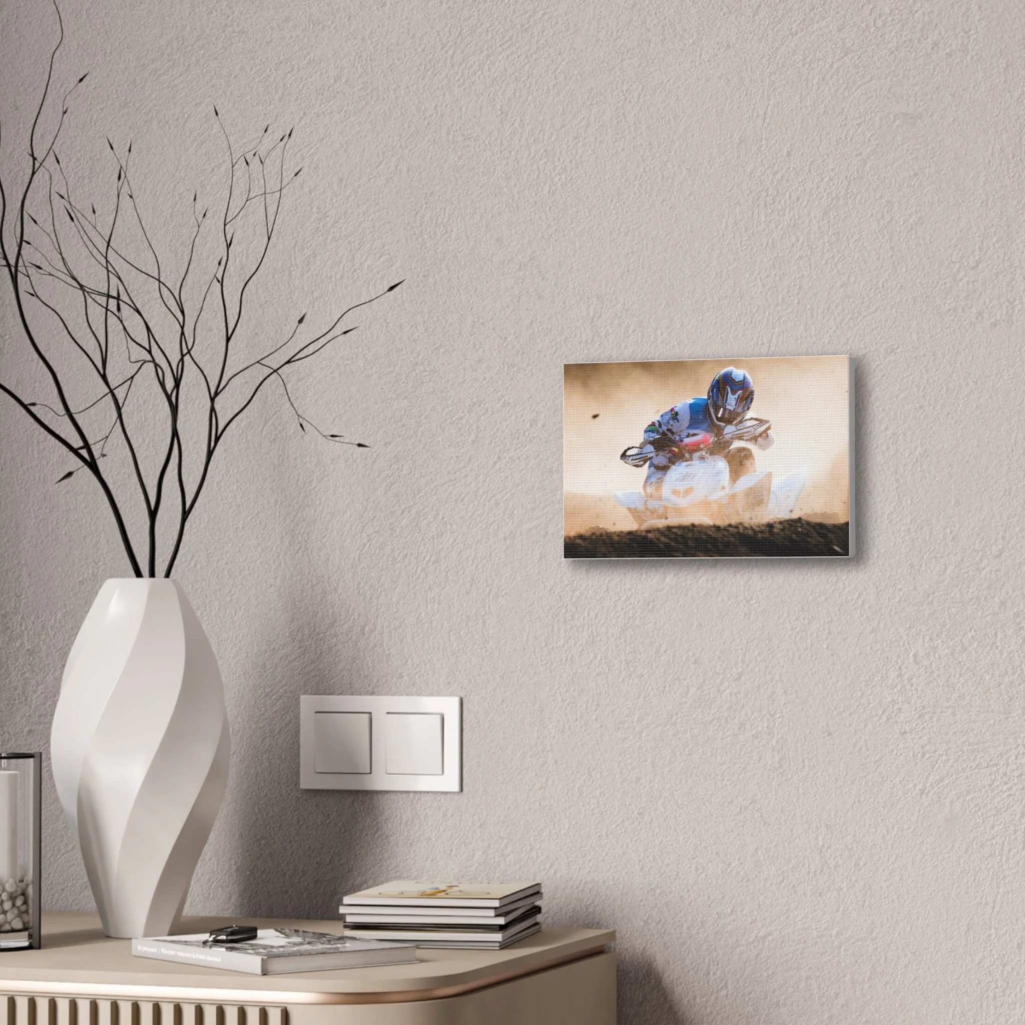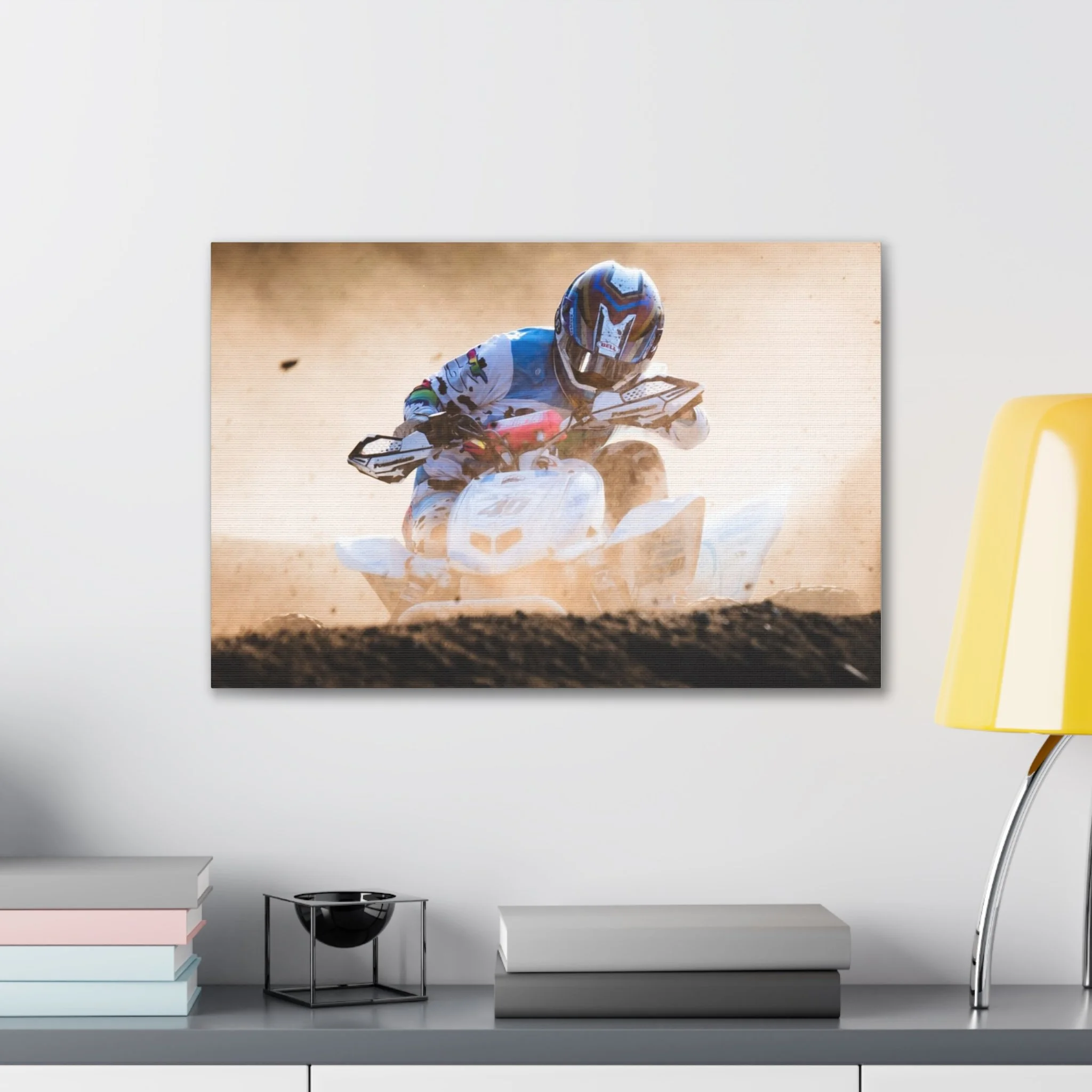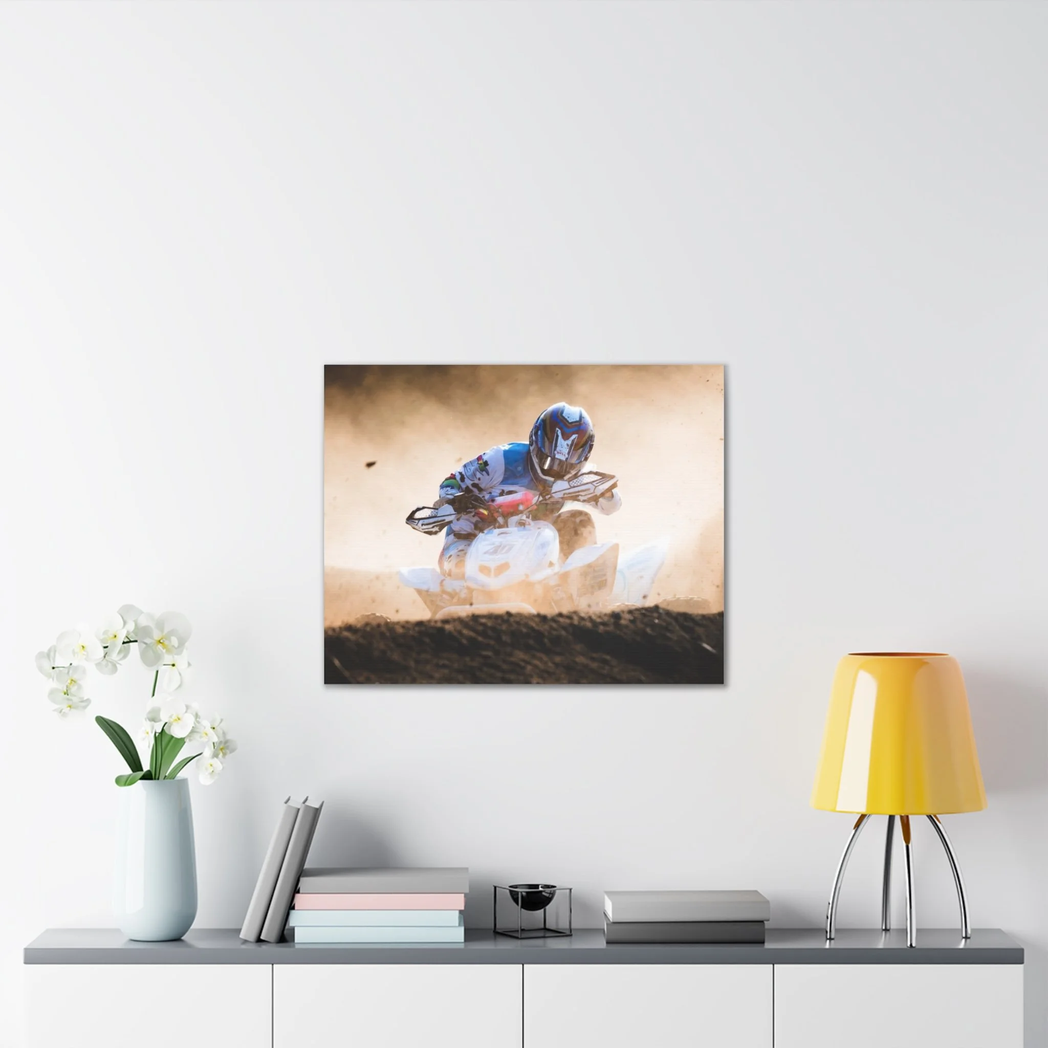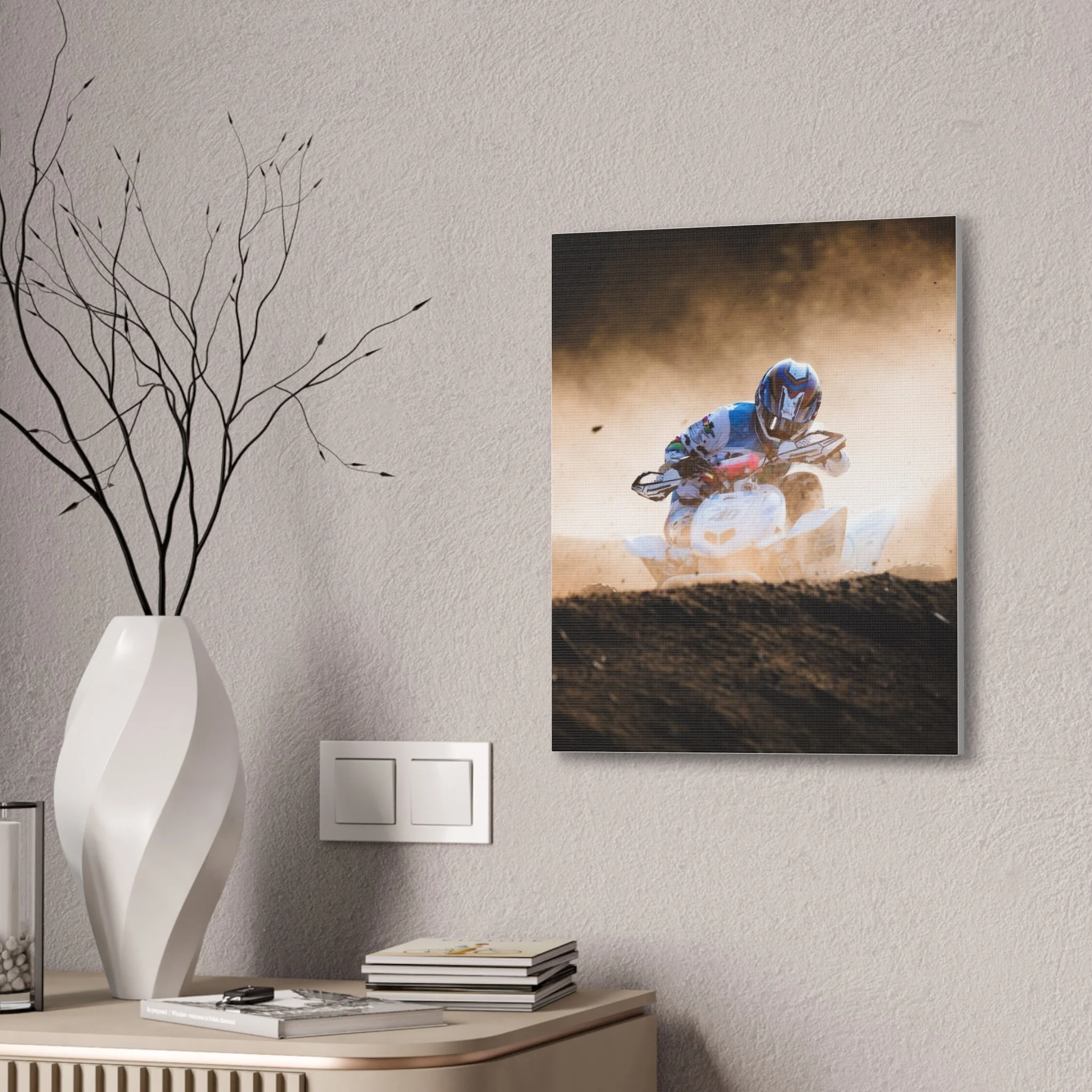 Bring the rush of open dirt and engine roar into any room with this personal photo stretched canvas print. The high-contrast image captures you mid-charge through a cloud of dust — grit, motion, and that split-second focus frozen on a durable polyester surface. Mounted on a sturdy pinewood frame with clean, white sides, the piece sits confidently on a wall, evoking garage scenes, track day memories, or a cabin corner where adventure gear lives. It reads like a snapshot of momentum: raw, immediate, and honest. Hang it above a workbench, in a rec room, or in a home office to remind you of throttle-down thrills and the quiet satisfaction after a long ride.