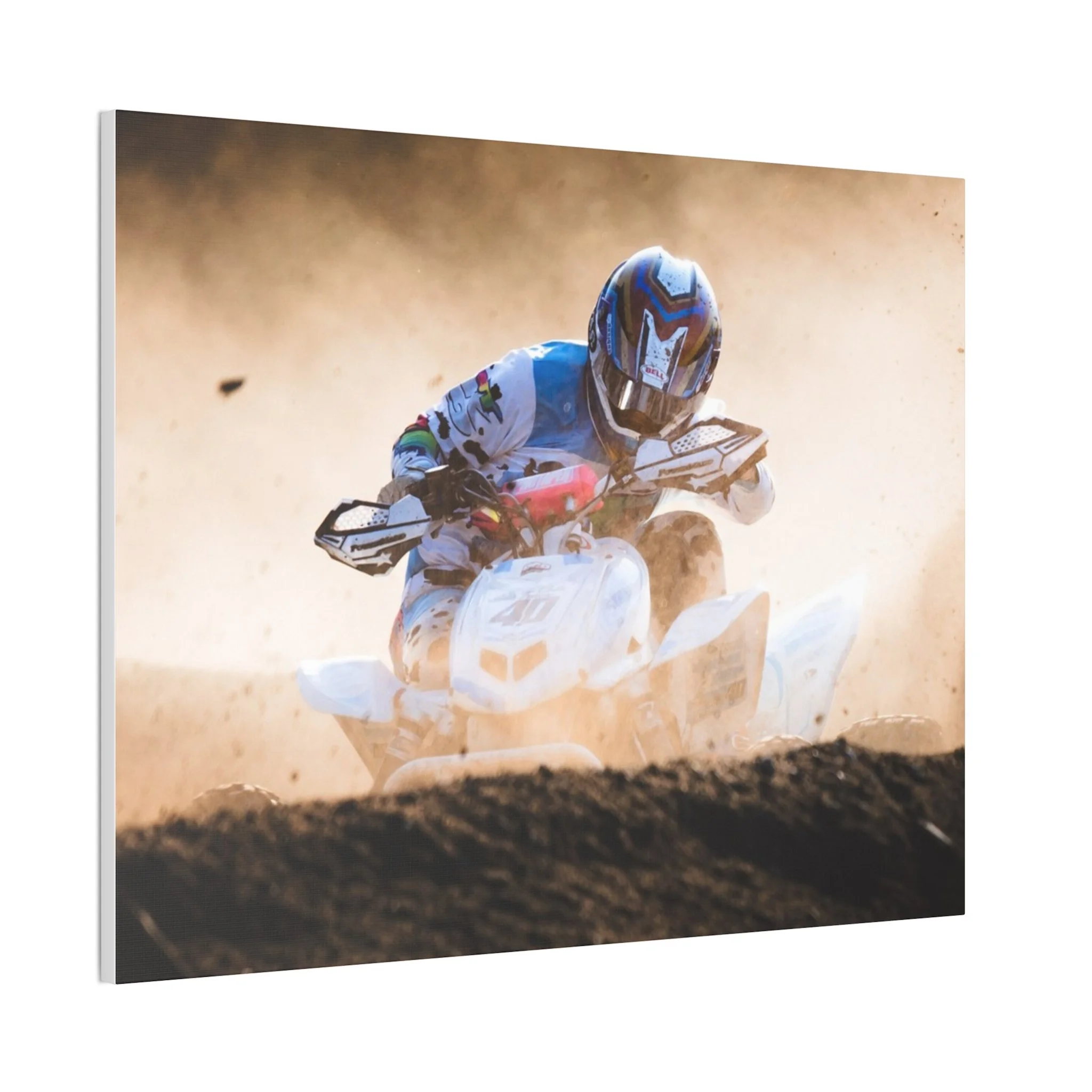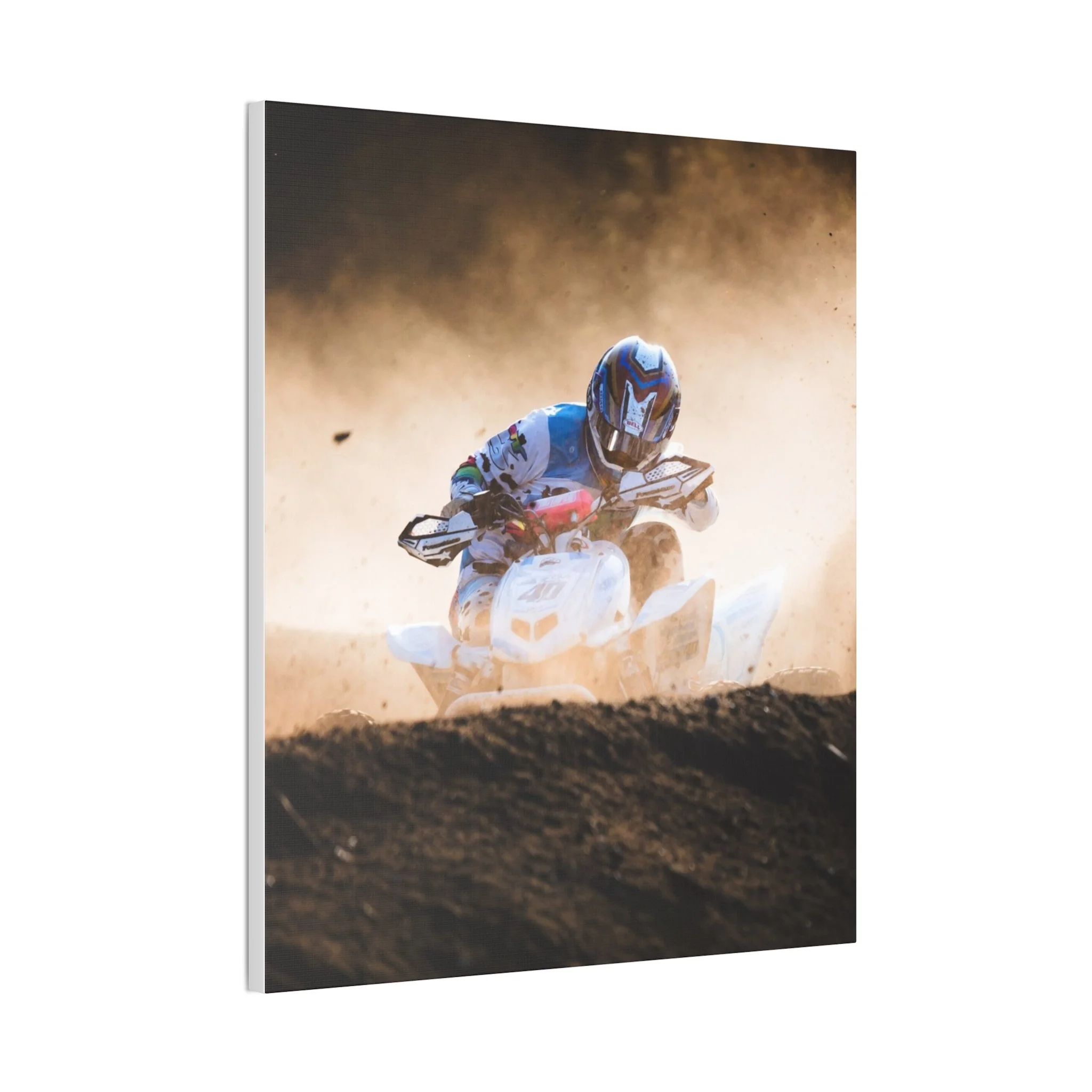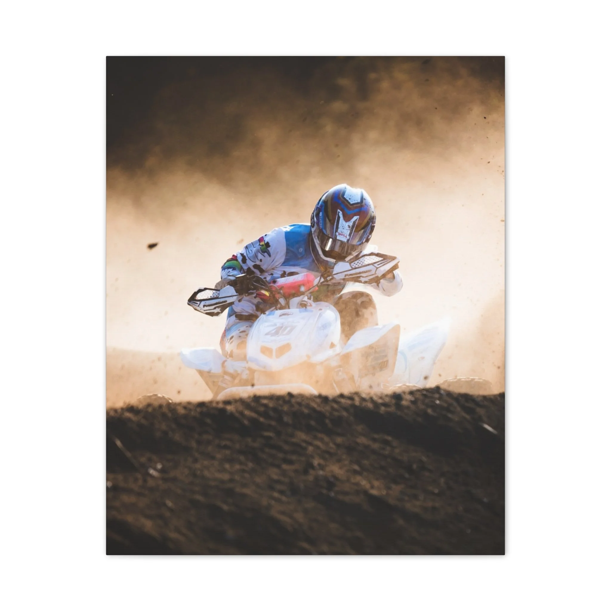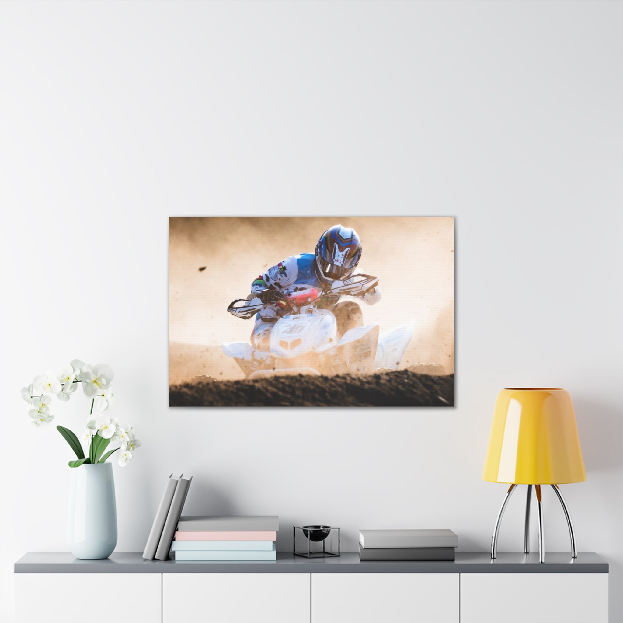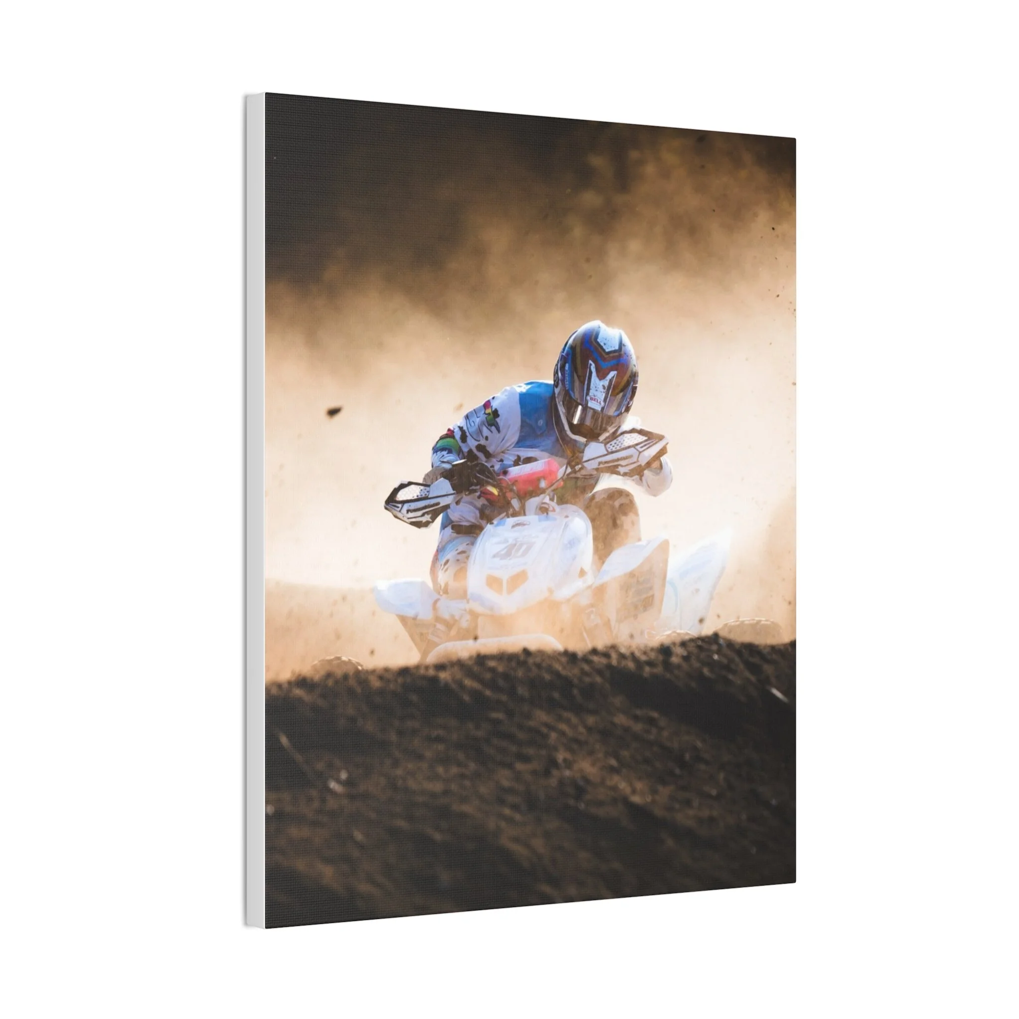 Bring the rush of open dirt and engine roar into any room with this personal photo stretched canvas print. The high-contrast image captures you mid-charge through a cloud of dust — grit, motion, and that split-second focus frozen on a durable polyester surface. Mounted on a sturdy pinewood frame with clean, white sides, the piece sits confidently on a wall, evoking garage scenes, track day memories, or a cabin corner where adventure gear lives. It reads like a snapshot of momentum: raw, immediate, and honest. Hang it above a workbench, in a rec room, or in a home office to remind you of throttle-down thrills and the quiet satisfaction after a long ride.