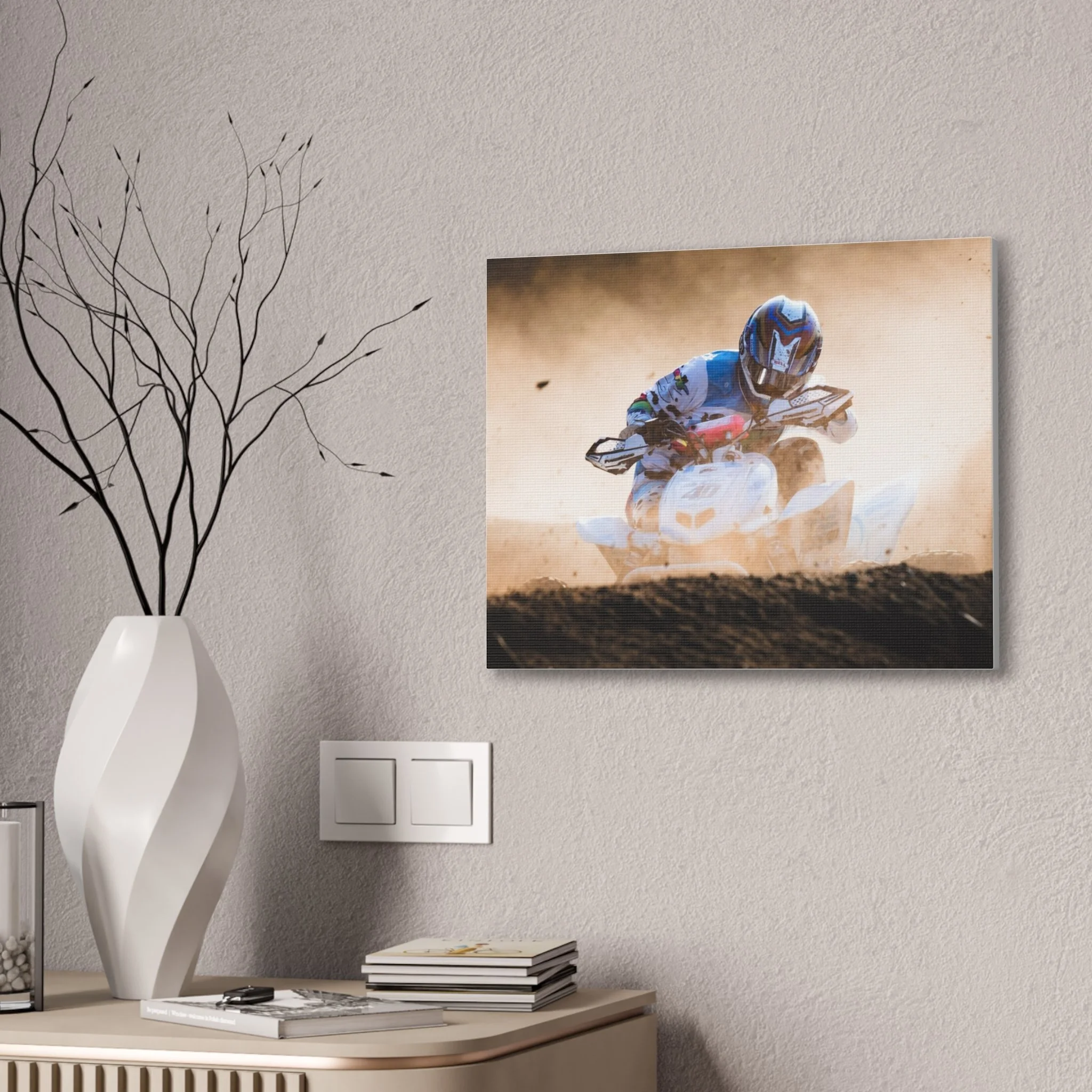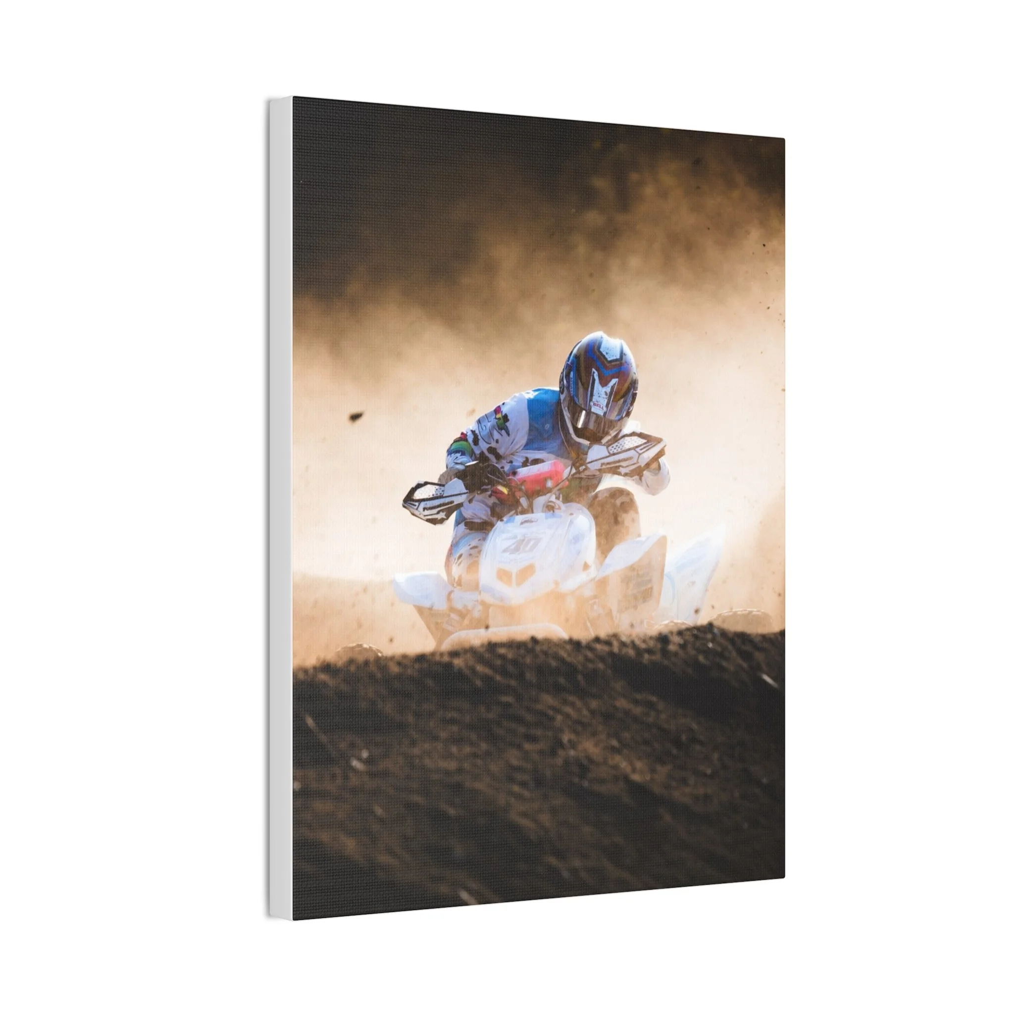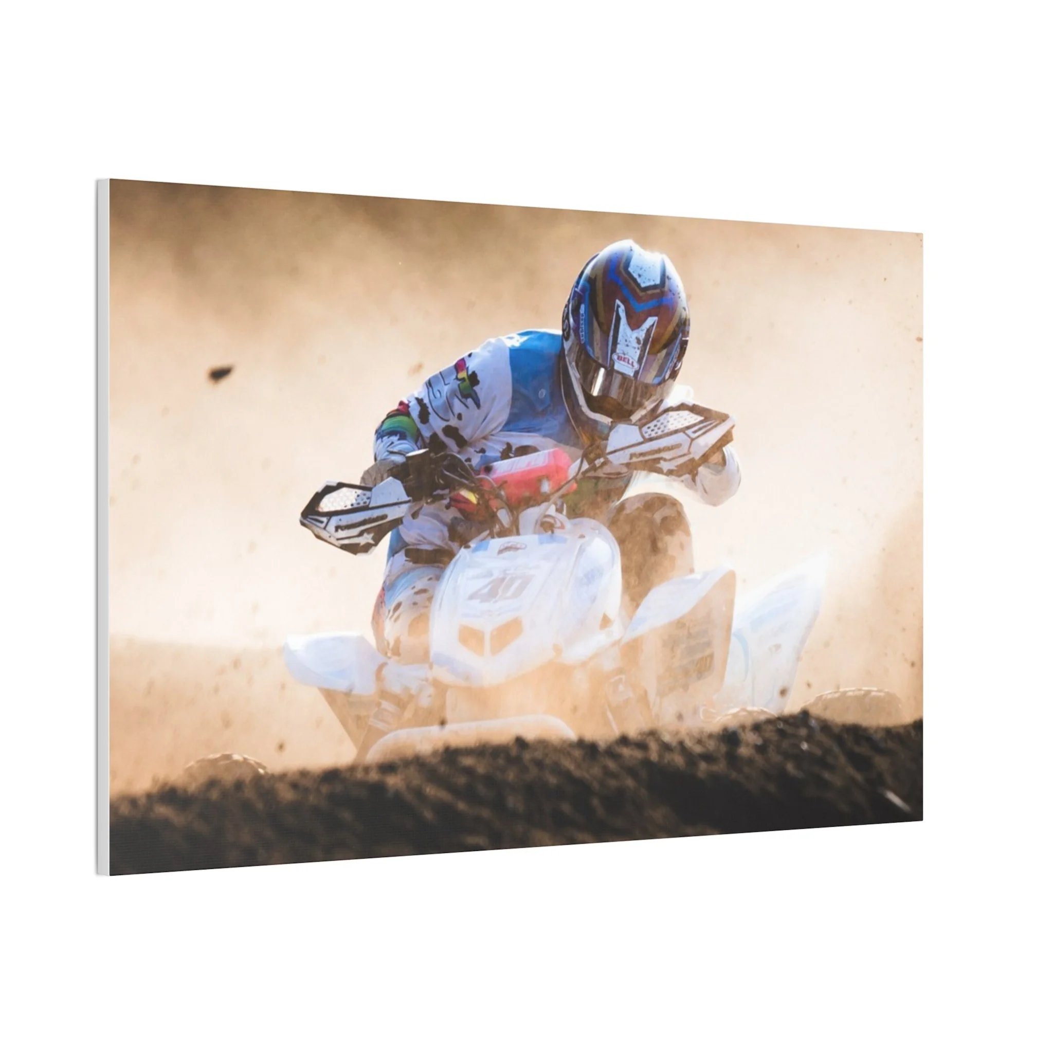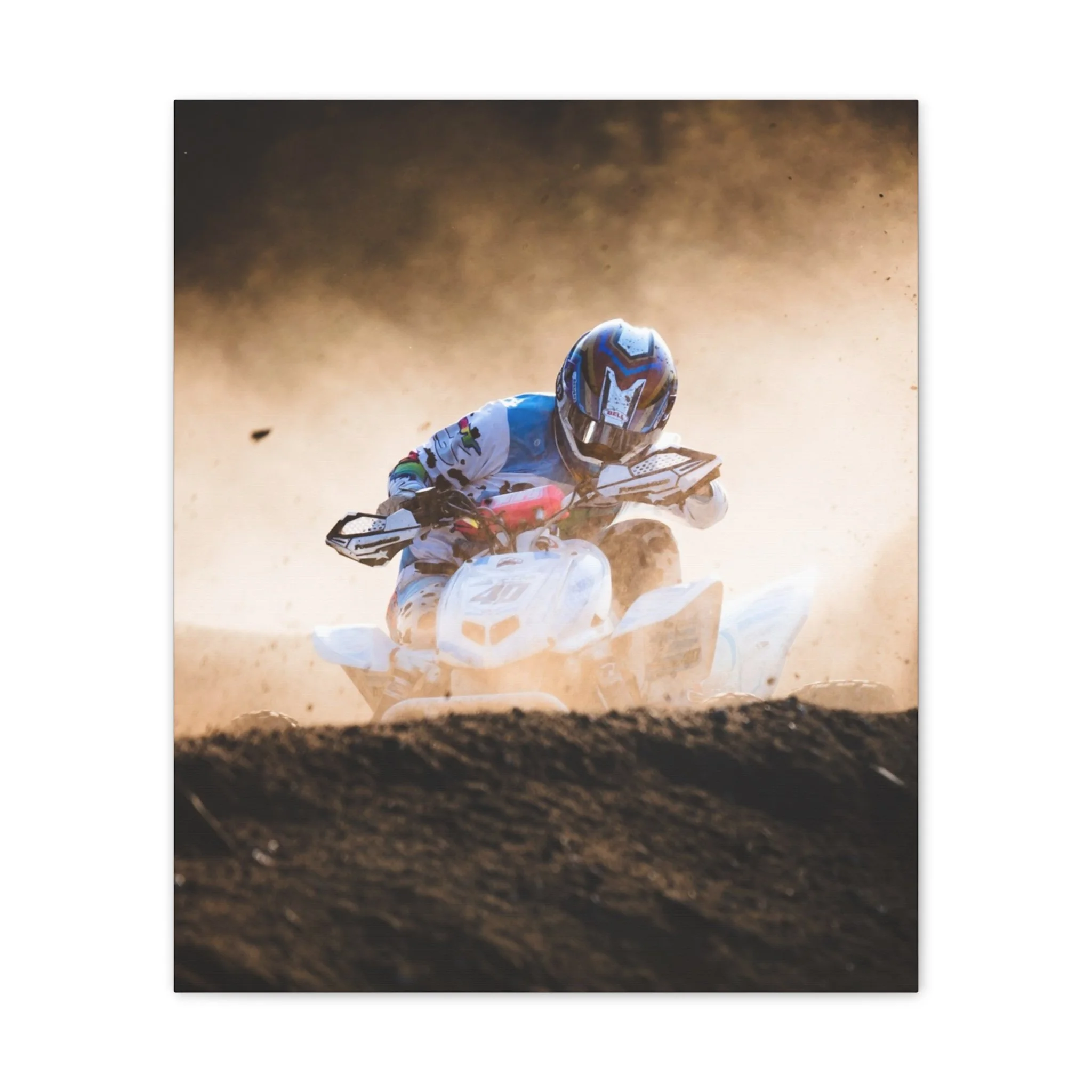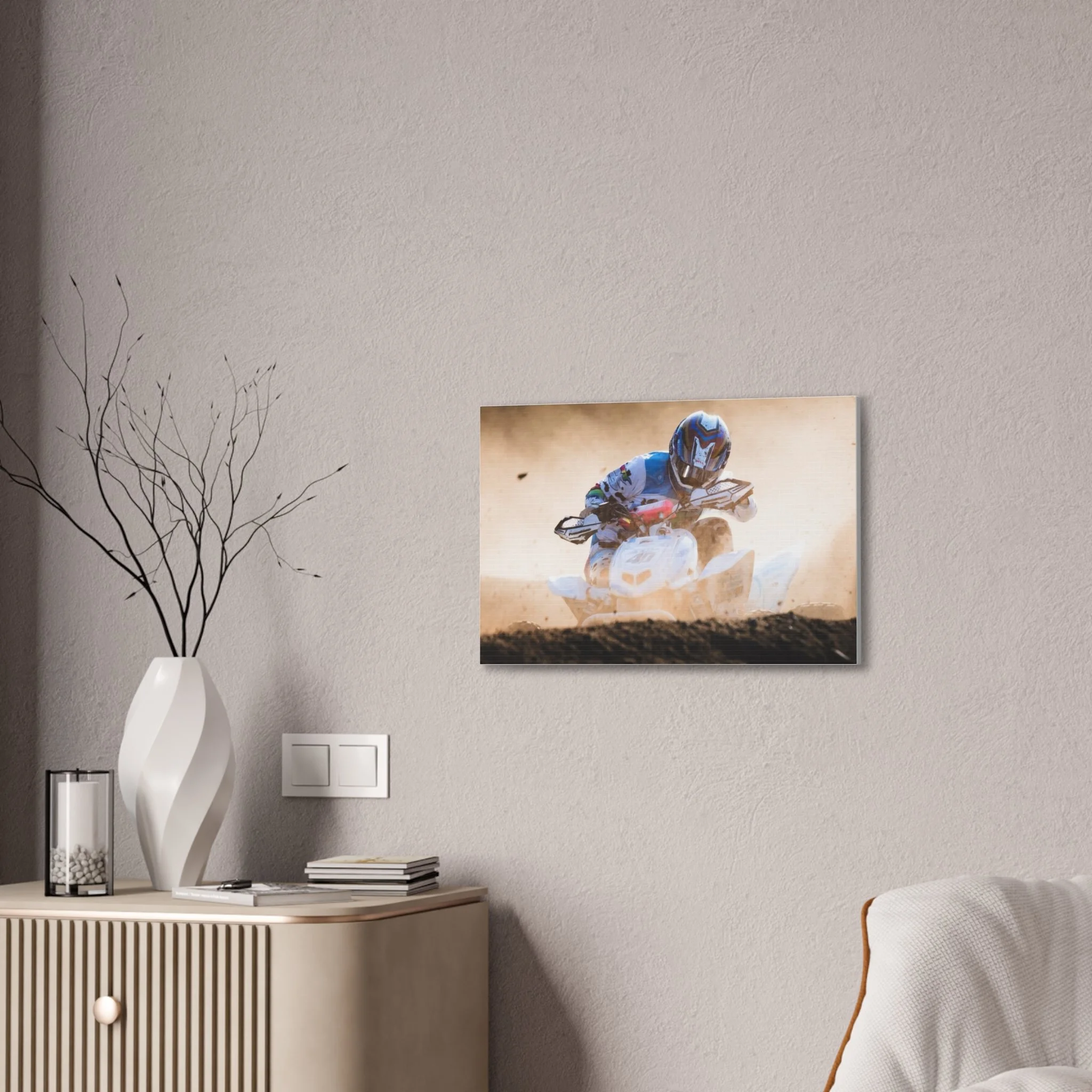 Bring the rush of open dirt and engine roar into any room with this personal photo stretched canvas print. The high-contrast image captures you mid-charge through a cloud of dust — grit, motion, and that split-second focus frozen on a durable polyester surface. Mounted on a sturdy pinewood frame with clean, white sides, the piece sits confidently on a wall, evoking garage scenes, track day memories, or a cabin corner where adventure gear lives. It reads like a snapshot of momentum: raw, immediate, and honest. Hang it above a workbench, in a rec room, or in a home office to remind you of throttle-down thrills and the quiet satisfaction after a long ride.