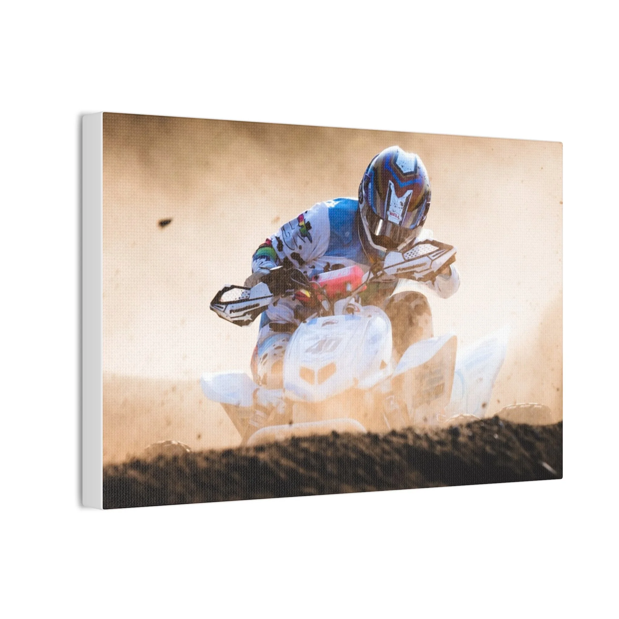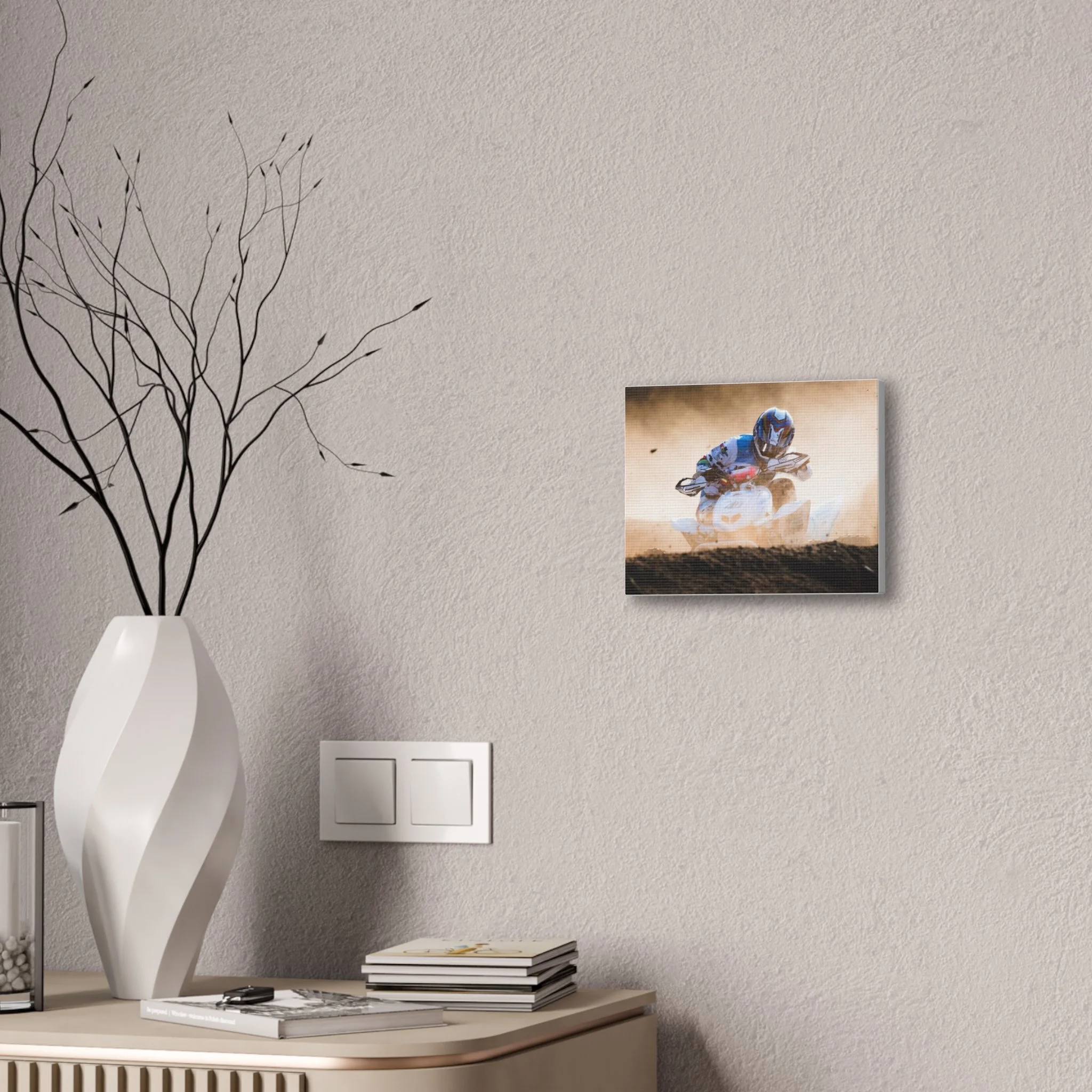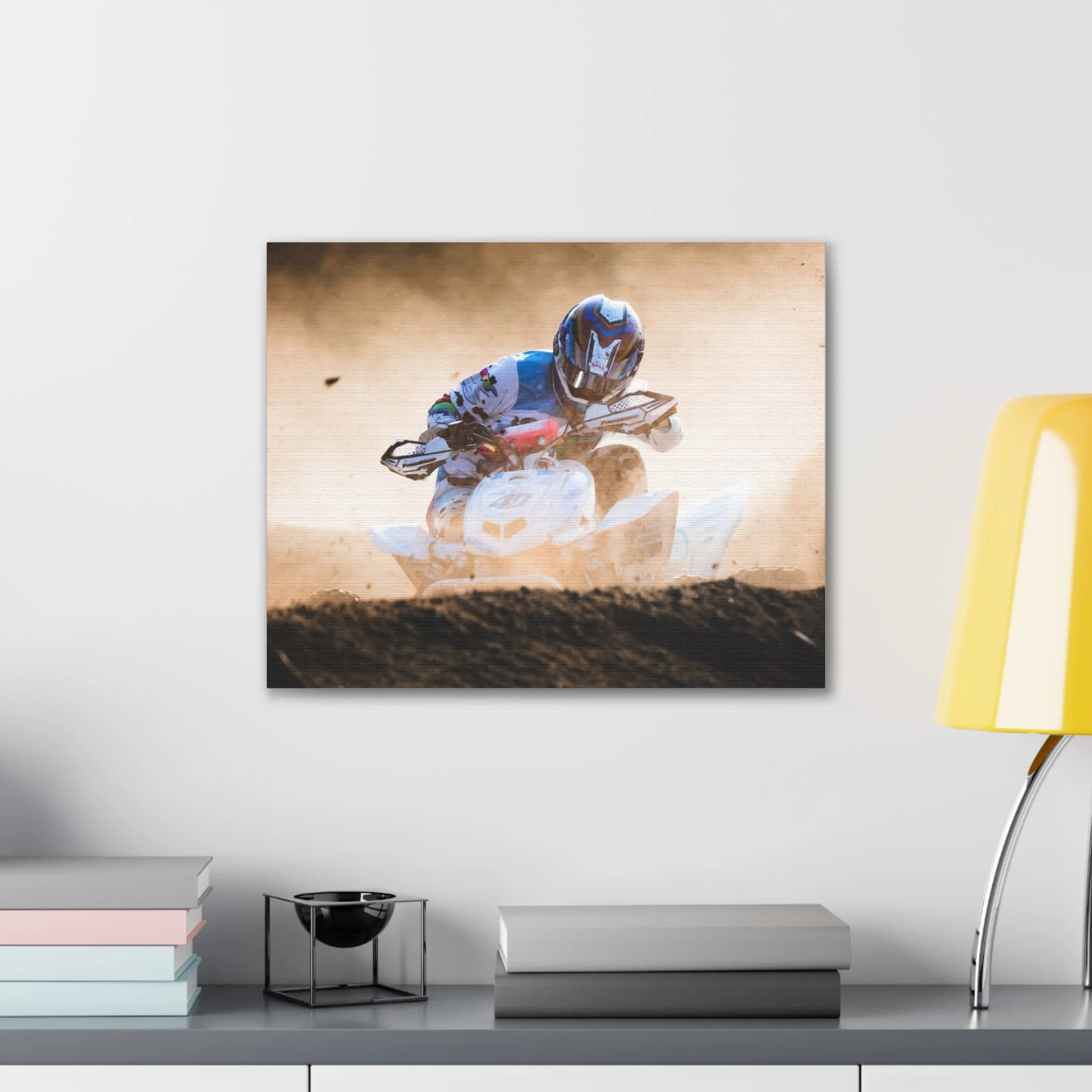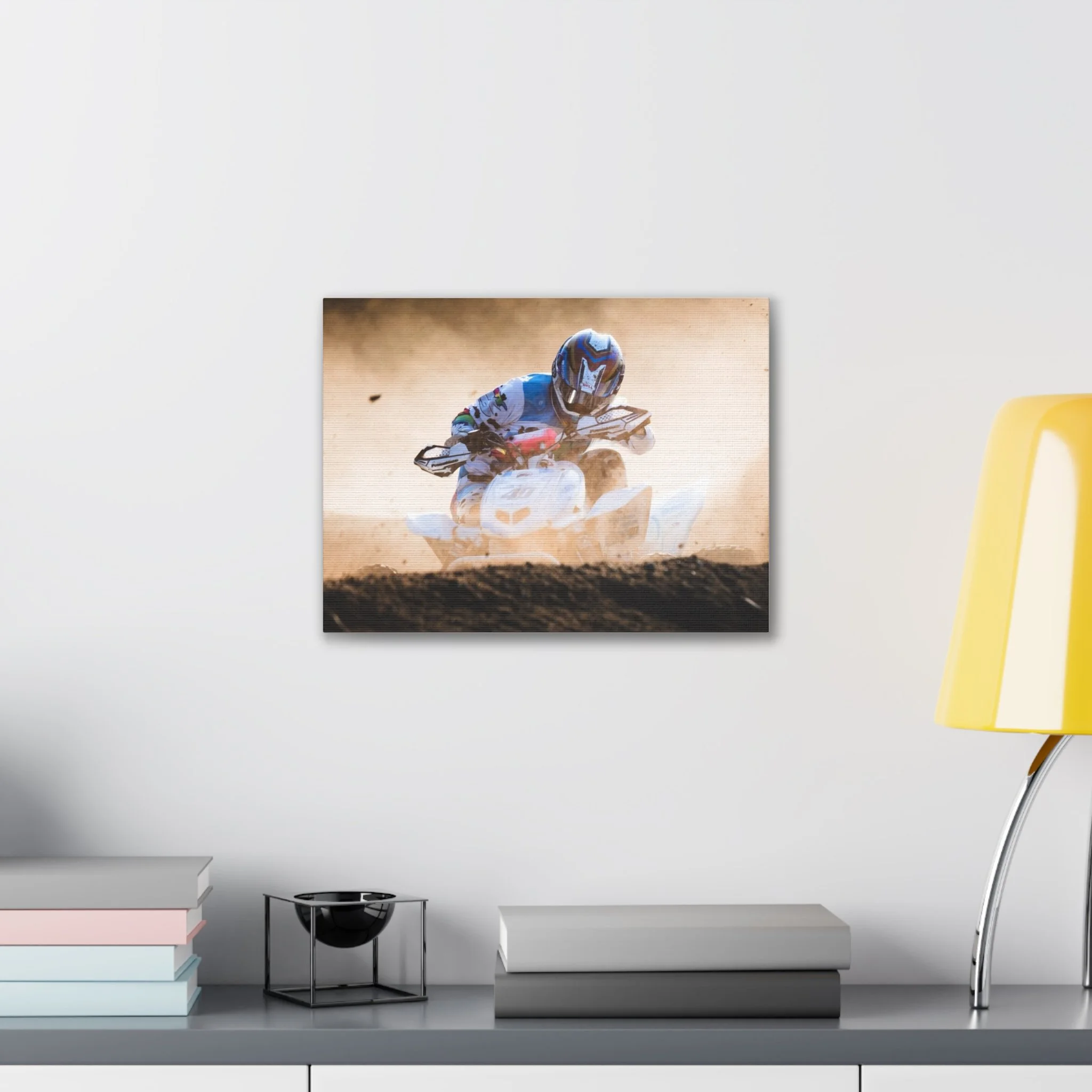 Bring the rush of open dirt and engine roar into any room with this personal photo stretched canvas print. The high-contrast image captures you mid-charge through a cloud of dust — grit, motion, and that split-second focus frozen on a durable polyester surface. Mounted on a sturdy pinewood frame with clean, white sides, the piece sits confidently on a wall, evoking garage scenes, track day memories, or a cabin corner where adventure gear lives. It reads like a snapshot of momentum: raw, immediate, and honest. Hang it above a workbench, in a rec room, or in a home office to remind you of throttle-down thrills and the quiet satisfaction after a long ride.