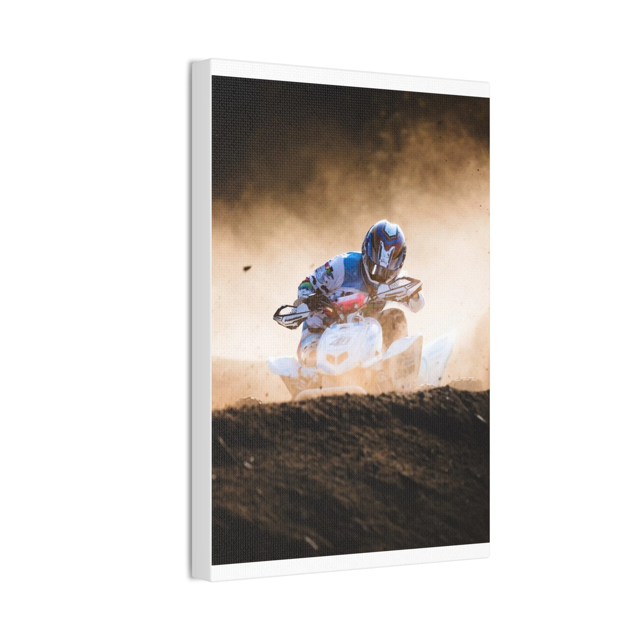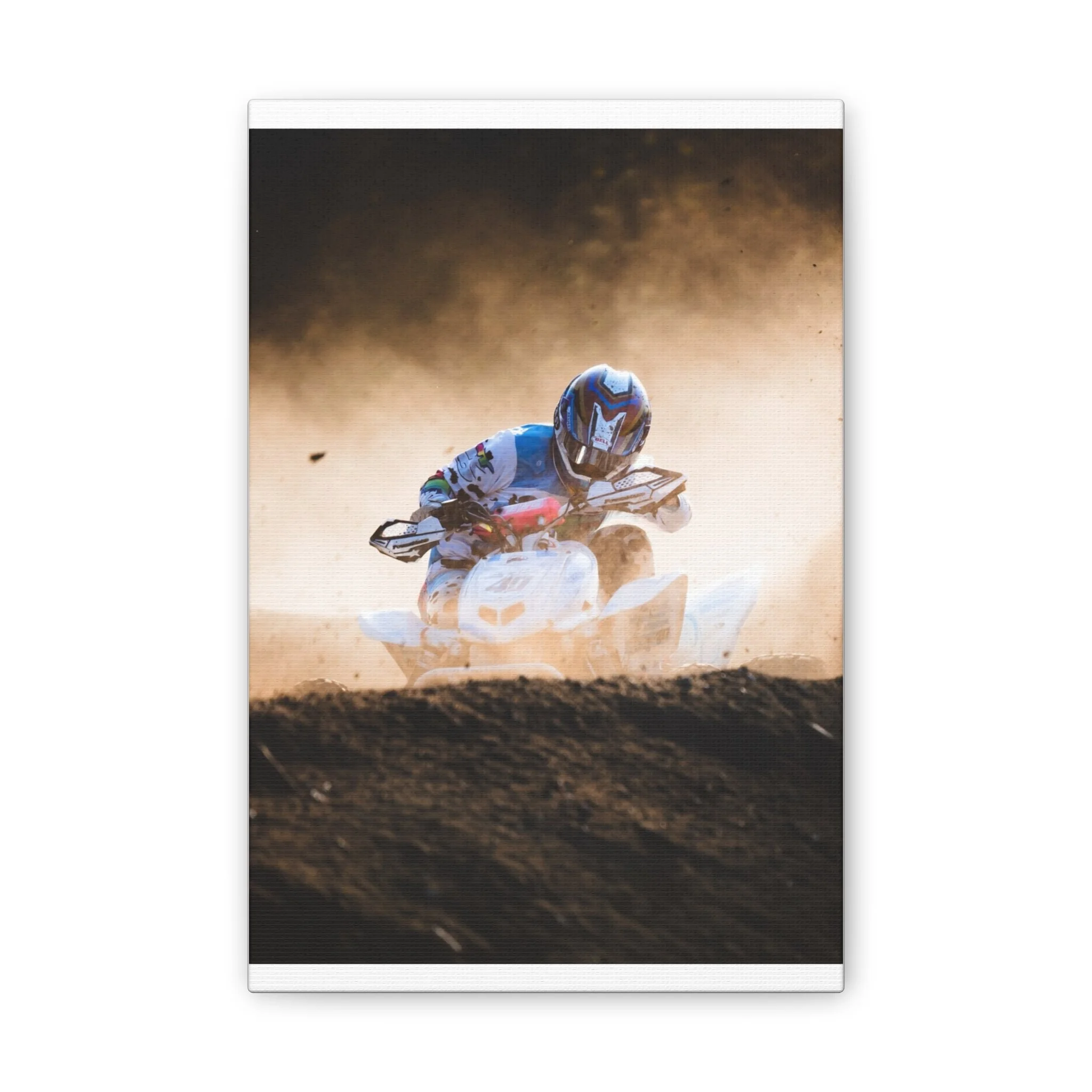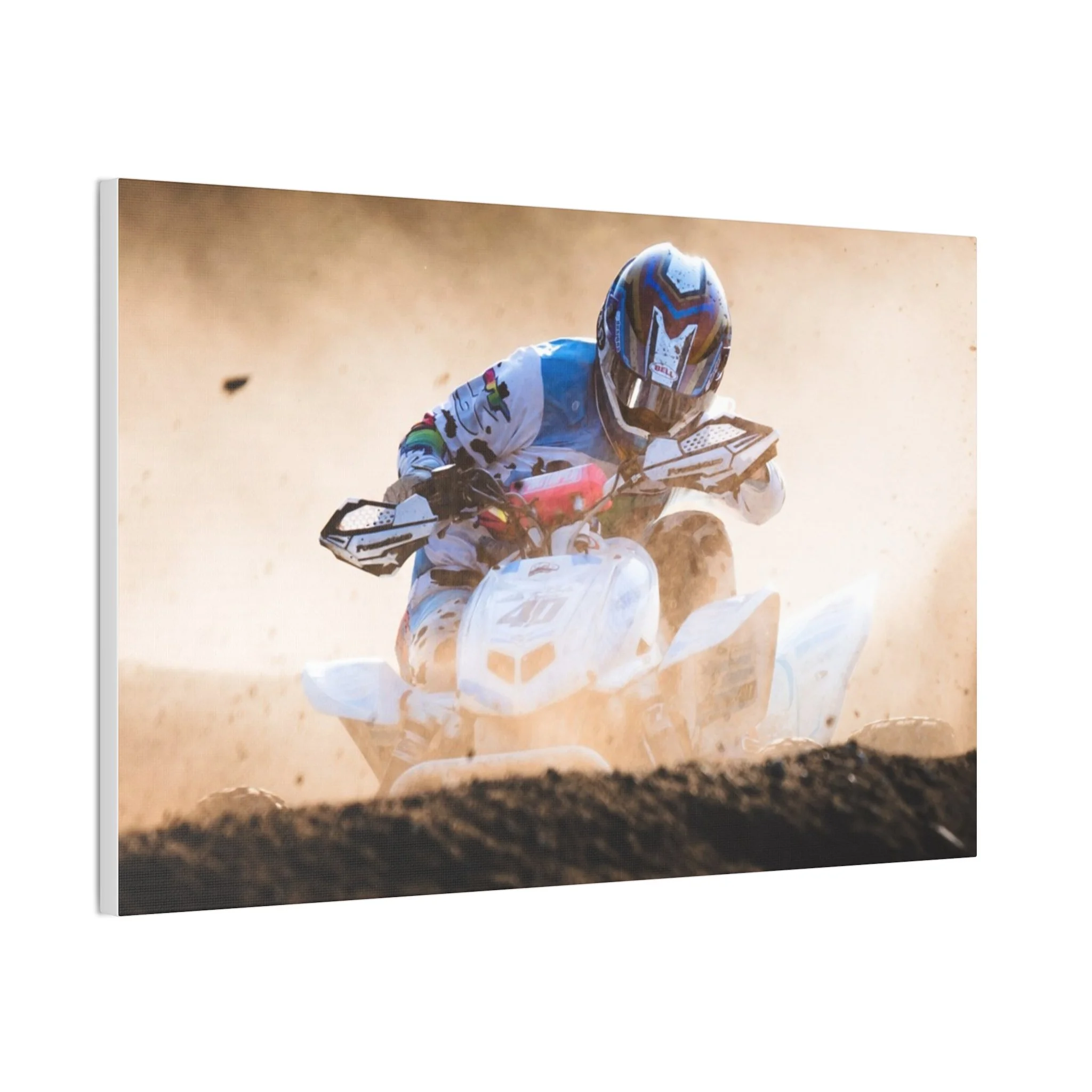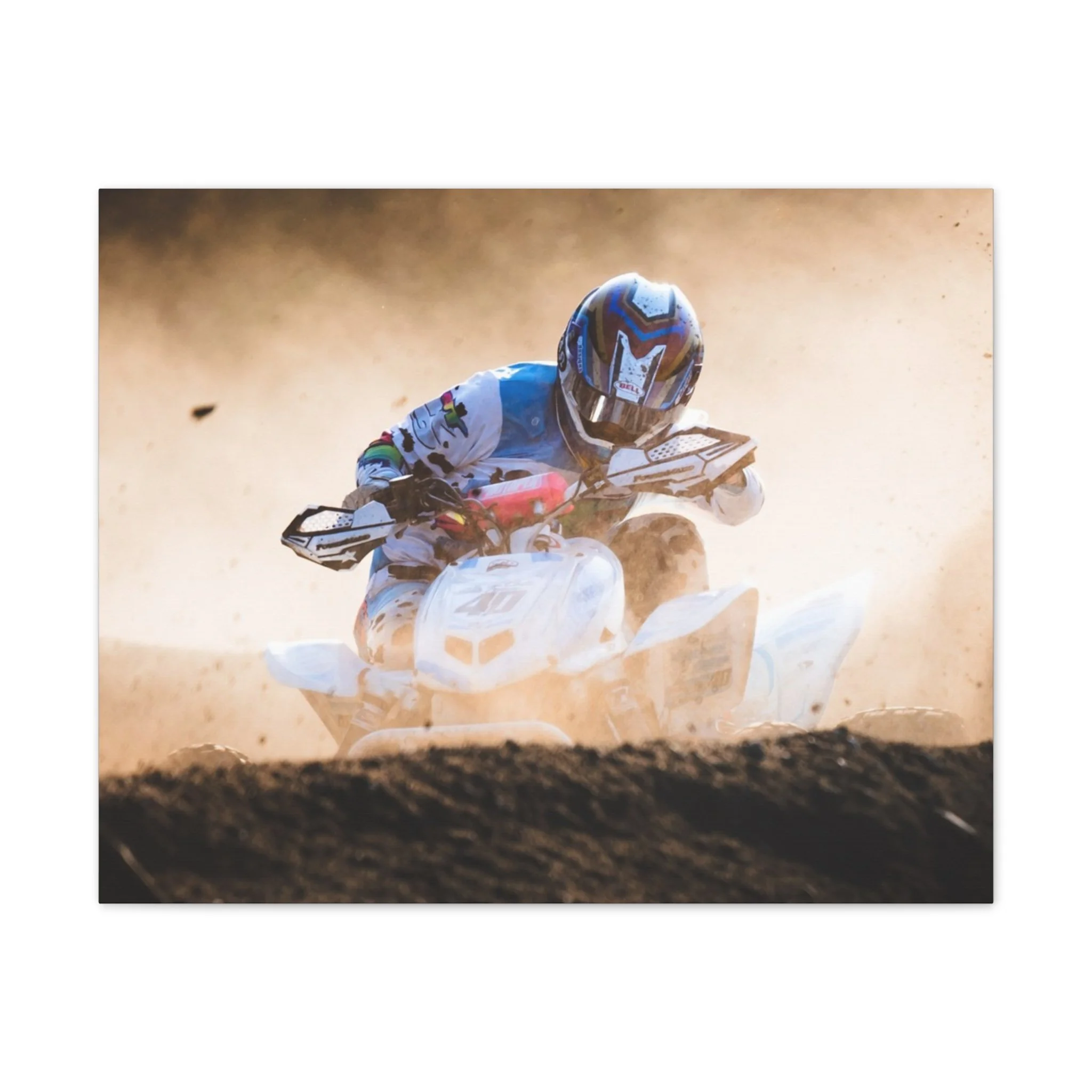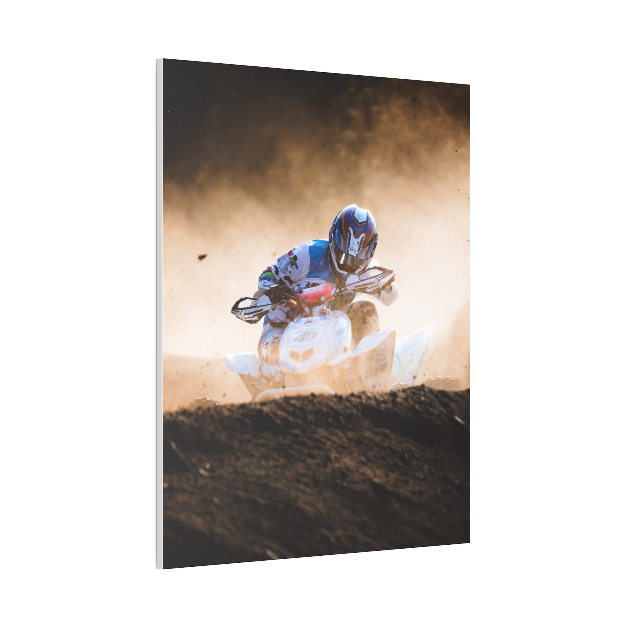 Bring the rush of open dirt and engine roar into any room with this personal photo stretched canvas print. The high-contrast image captures you mid-charge through a cloud of dust — grit, motion, and that split-second focus frozen on a durable polyester surface. Mounted on a sturdy pinewood frame with clean, white sides, the piece sits confidently on a wall, evoking garage scenes, track day memories, or a cabin corner where adventure gear lives. It reads like a snapshot of momentum: raw, immediate, and honest. Hang it above a workbench, in a rec room, or in a home office to remind you of throttle-down thrills and the quiet satisfaction after a long ride.
