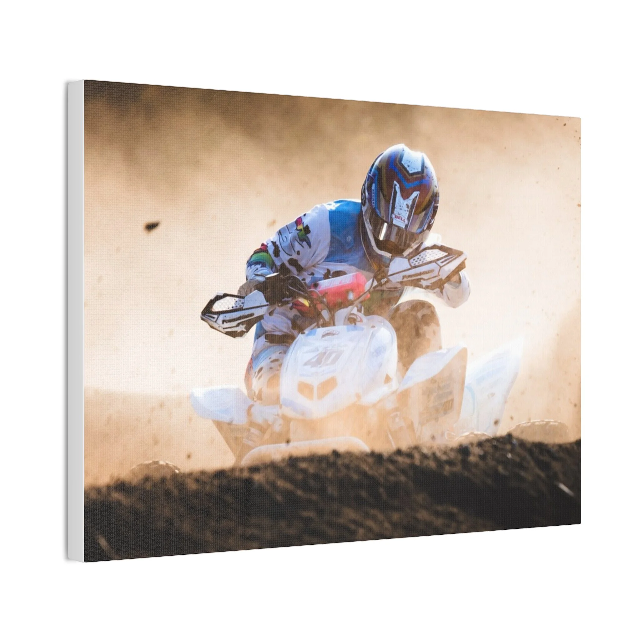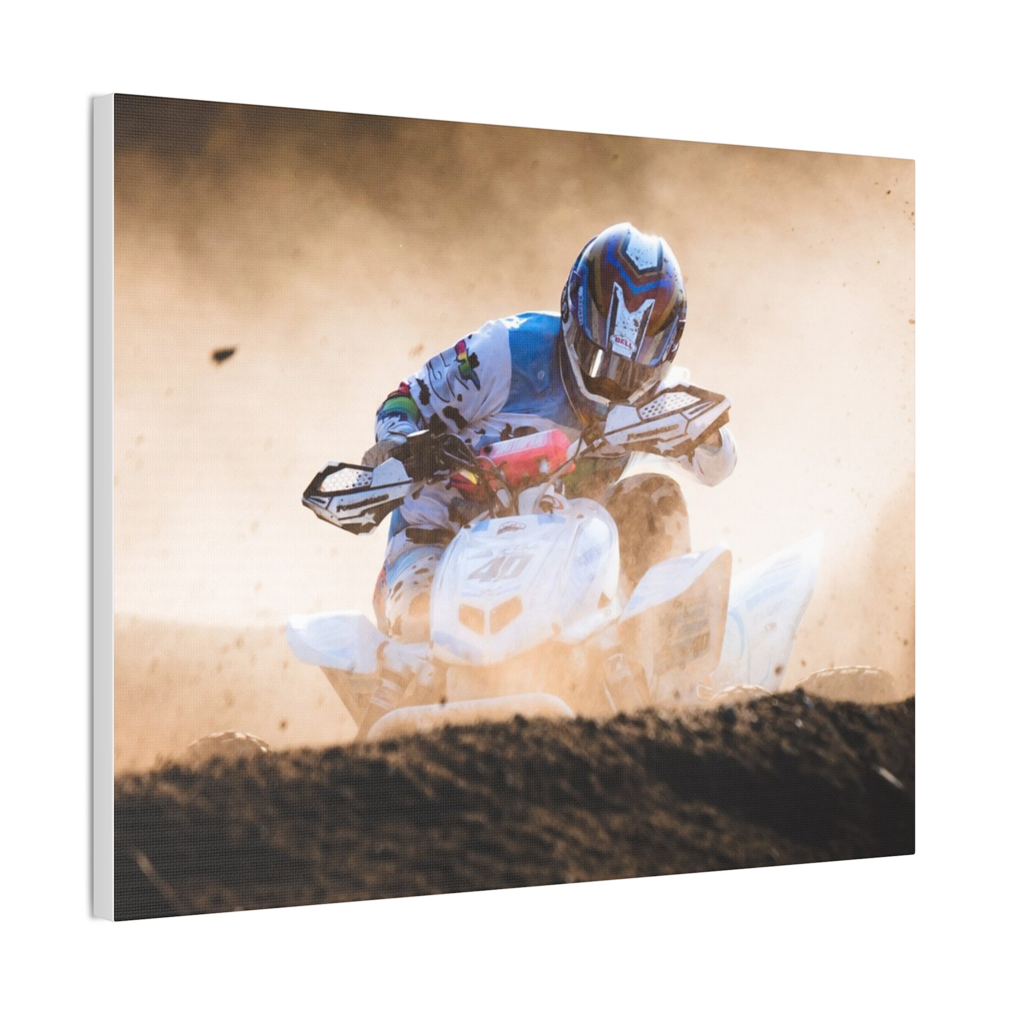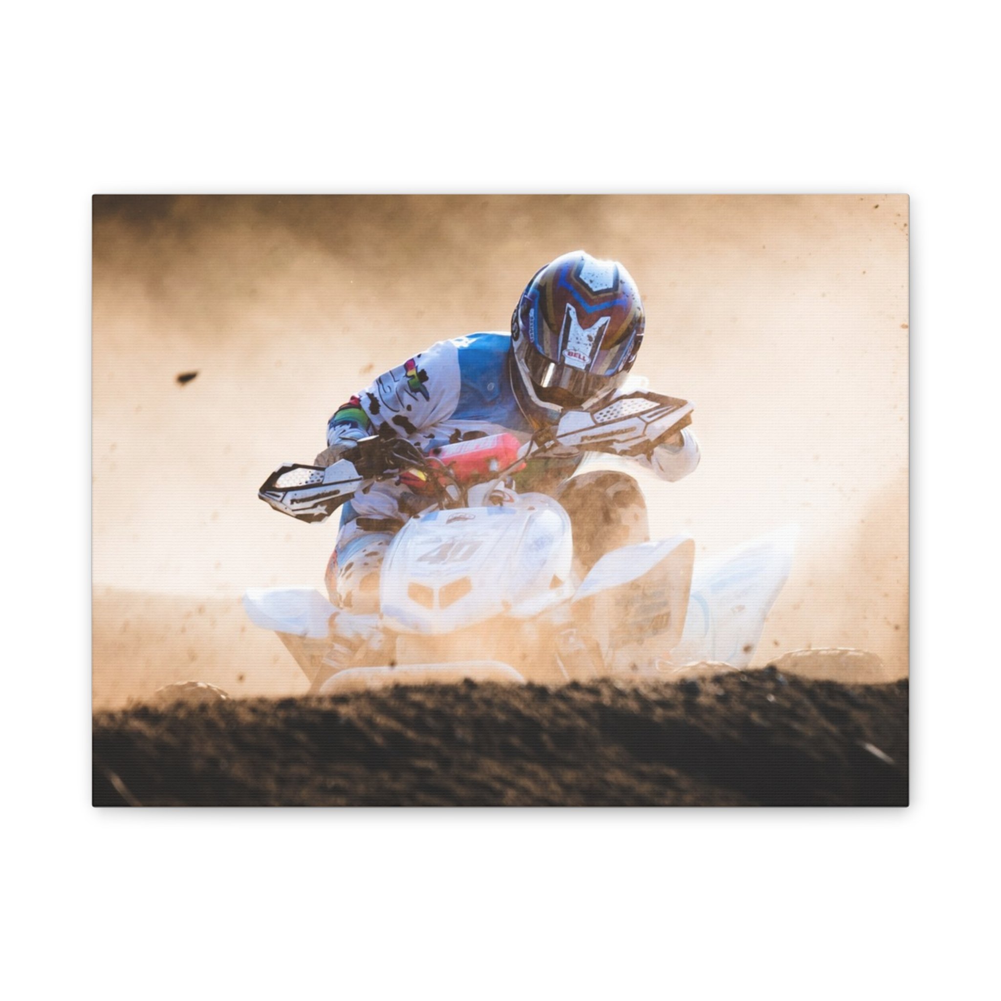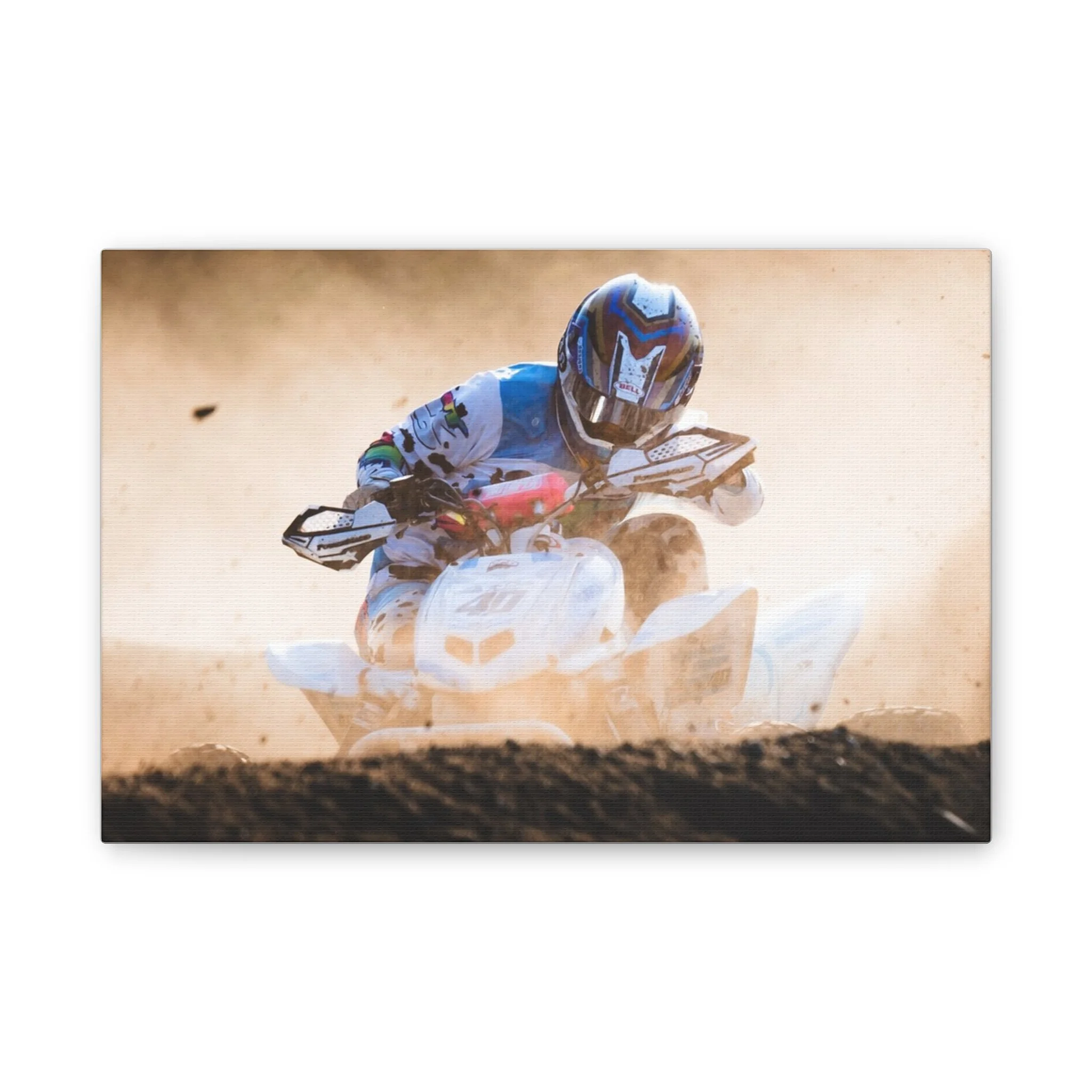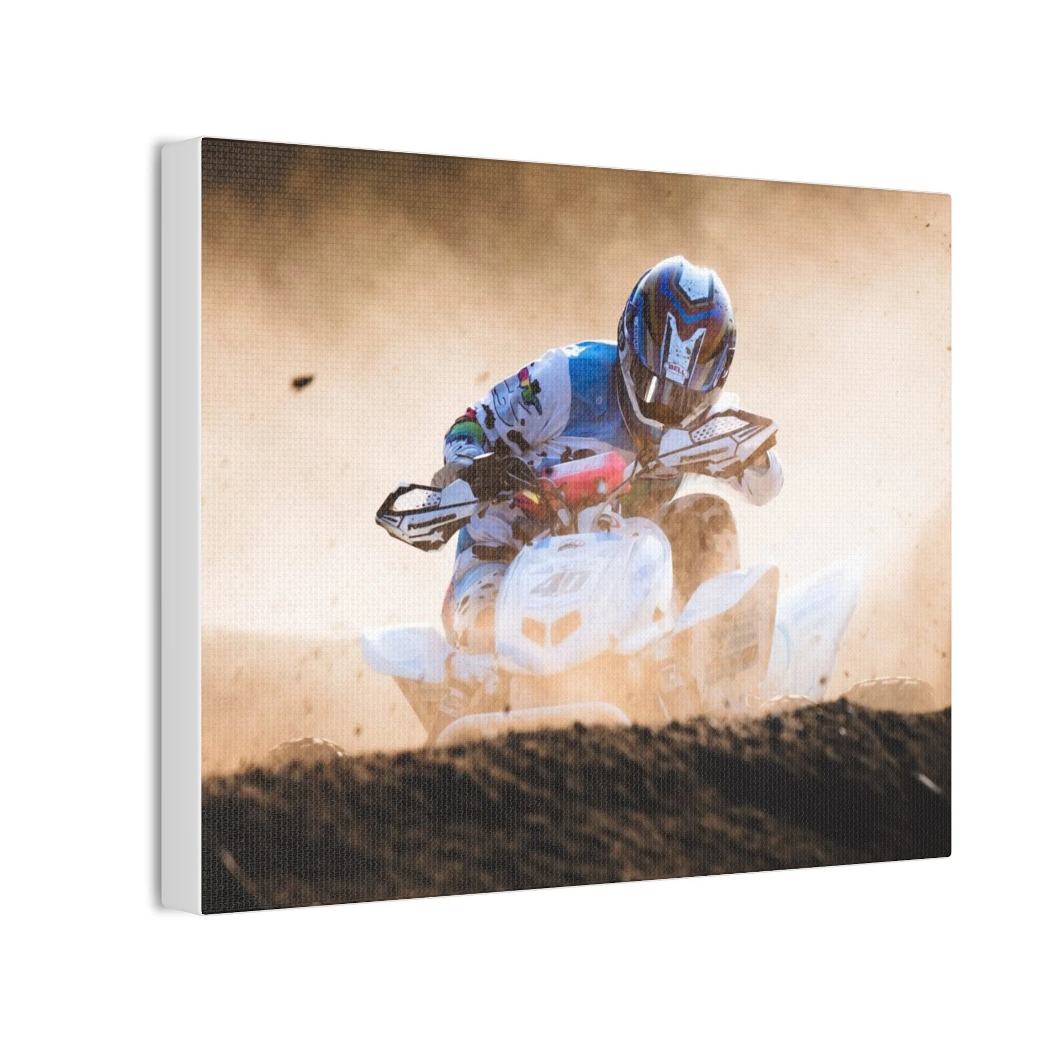 Bring the rush of open dirt and engine roar into any room with this personal photo stretched canvas print. The high-contrast image captures you mid-charge through a cloud of dust — grit, motion, and that split-second focus frozen on a durable polyester surface. Mounted on a sturdy pinewood frame with clean, white sides, the piece sits confidently on a wall, evoking garage scenes, track day memories, or a cabin corner where adventure gear lives. It reads like a snapshot of momentum: raw, immediate, and honest. Hang it above a workbench, in a rec room, or in a home office to remind you of throttle-down thrills and the quiet satisfaction after a long ride.