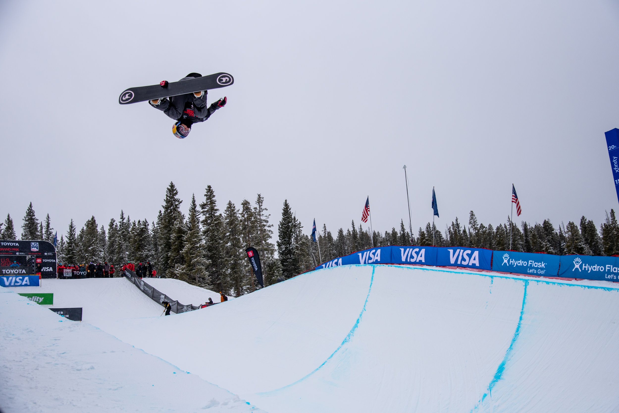 A snowboarder performing a stunt in mid-air during a competition at the U.S. Grand Prix, with snow-covered trees and a cloudy sky in the background.
